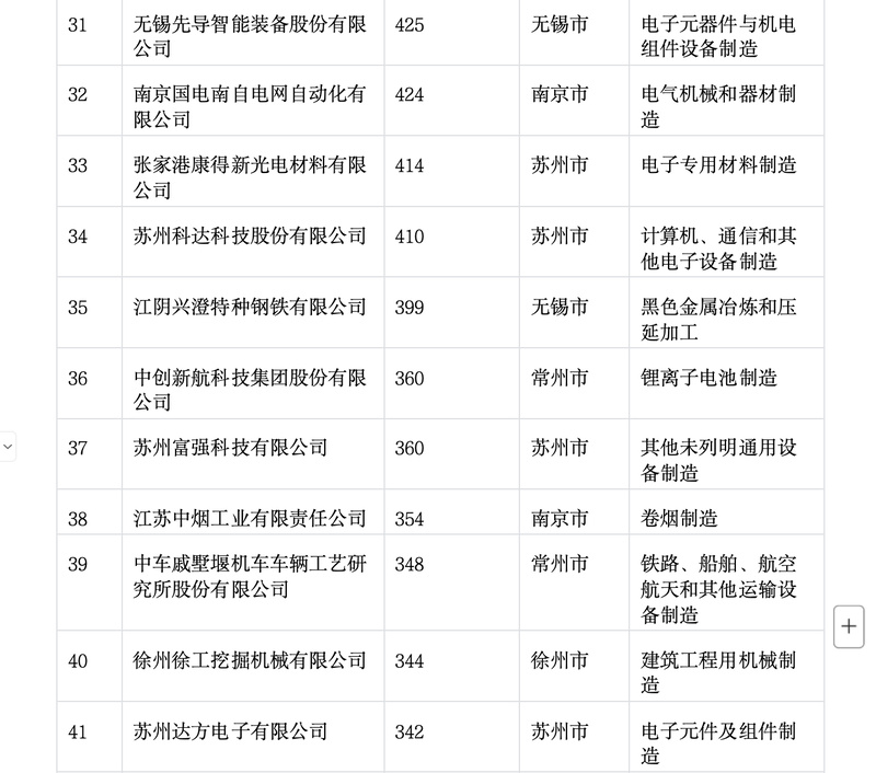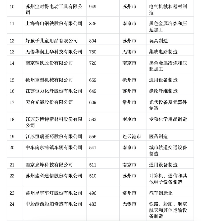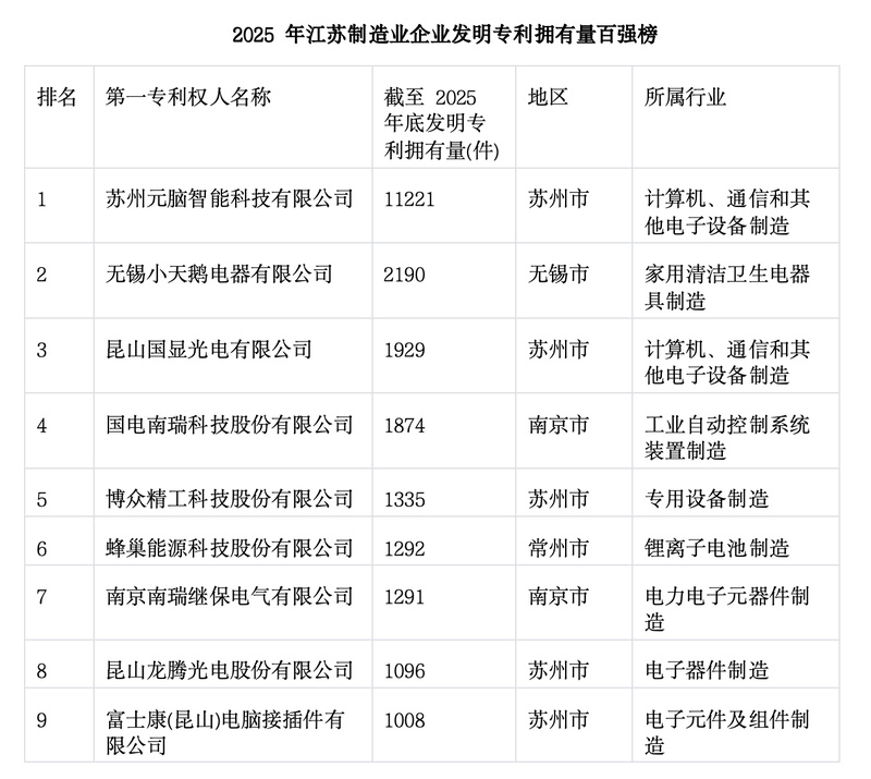 江苏省知识产权保护中心公布的数据显示,截至2025年底,百强榜企业共拥有发明专利5.43万件,较上一年同期增长0.55万件,占全省企业发明专利拥有量的9.90%。从行业分布来看,上榜企业主要集中在六大领域,其中电气机械和器材制造行业11家,计算机、通信和其他电子设备制造行业10家,专用设备制造行业7家,黑色金属冶炼和压延加工行业6家,医药制造行业4家,通用设备制造行业4家。