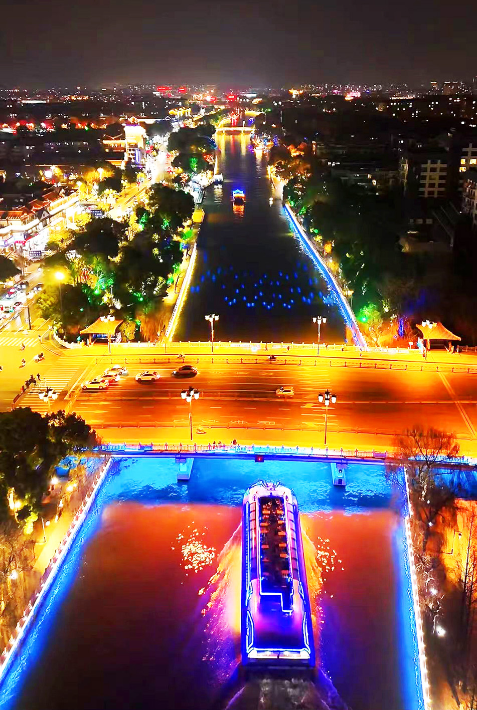 夜幕降临,古运河宛若一条蜿蜒的“光之丝带”,两岸连绵的灯火交相辉映,游船穿梭于流光溢彩间,形成一幅流动的画卷。 程曦 摄