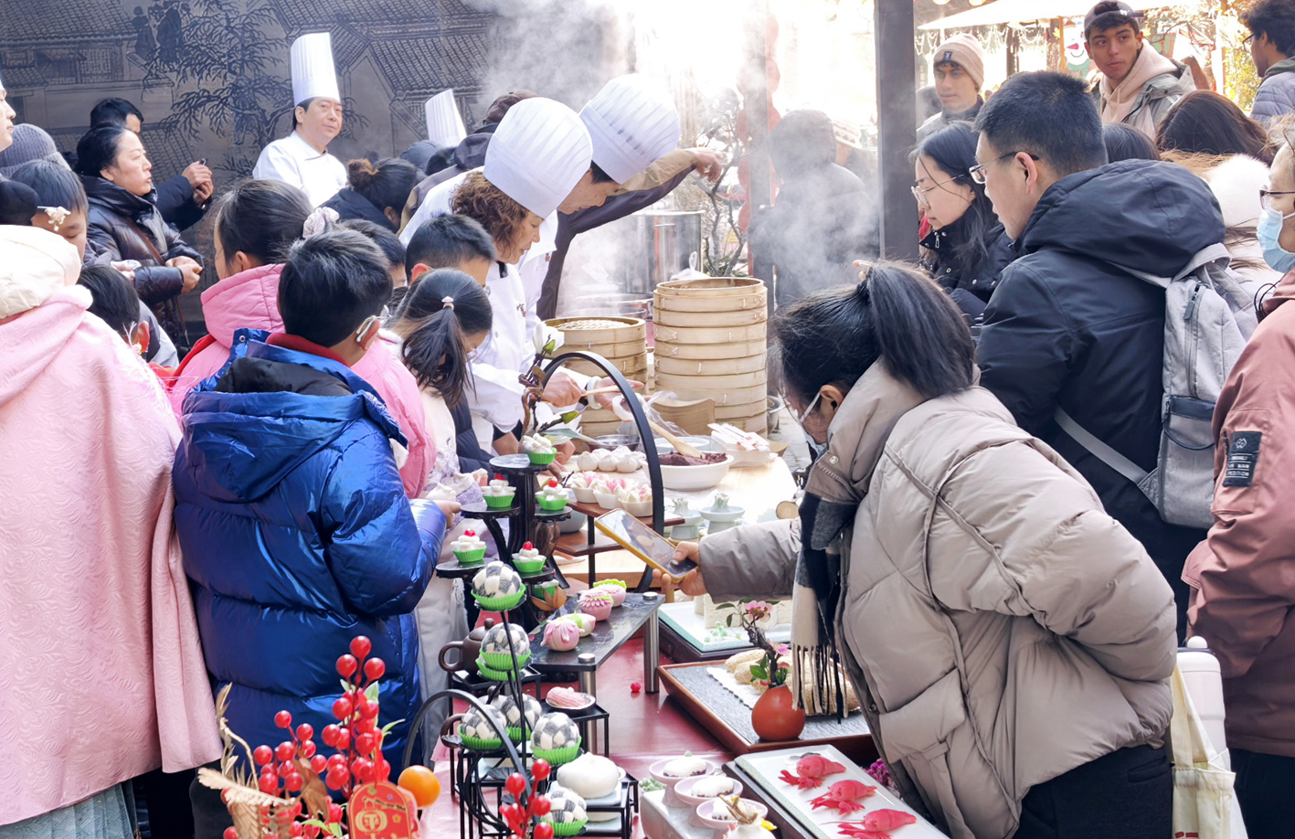 美食区蒸汽袅袅,年味正浓。富春茶点制作技艺传承人张福香带着大家揉面、包馅,重现扬州“年蒸”传统。不远处的灶台前,烹饪大师夏启泉细致讲解淮扬狮子头的制作窍门。居民小院内,卢勇老师手与刀巧妙配合,片出一根根干丝,同时向孩子们讲述年夜菜“十全十美”“年年有余”的美好寓意。书法体验区同样热闹,书法家与小学生共同挥毫,将一副副春联送到市民手中。