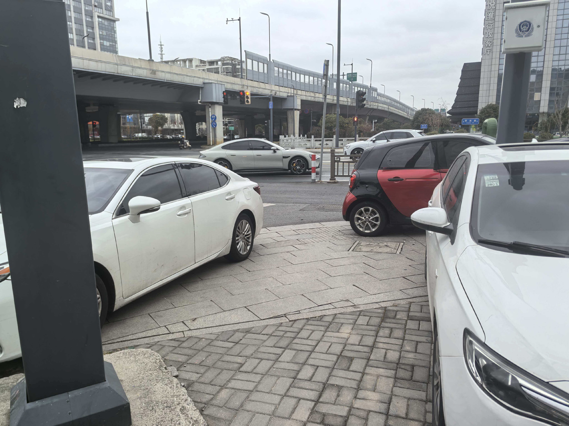在润扬路与翠岗路交叉口东南角人行道拐弯处,两辆机动车横停在人行道上。因机动车横停,导致人行道被“截断”。在旁边的非机动车道上,三辆机动车未停放在停车区域。记者注意到,因人行道和非机动车道有机动车占用,过往行人和非机动车通行时出现困难。