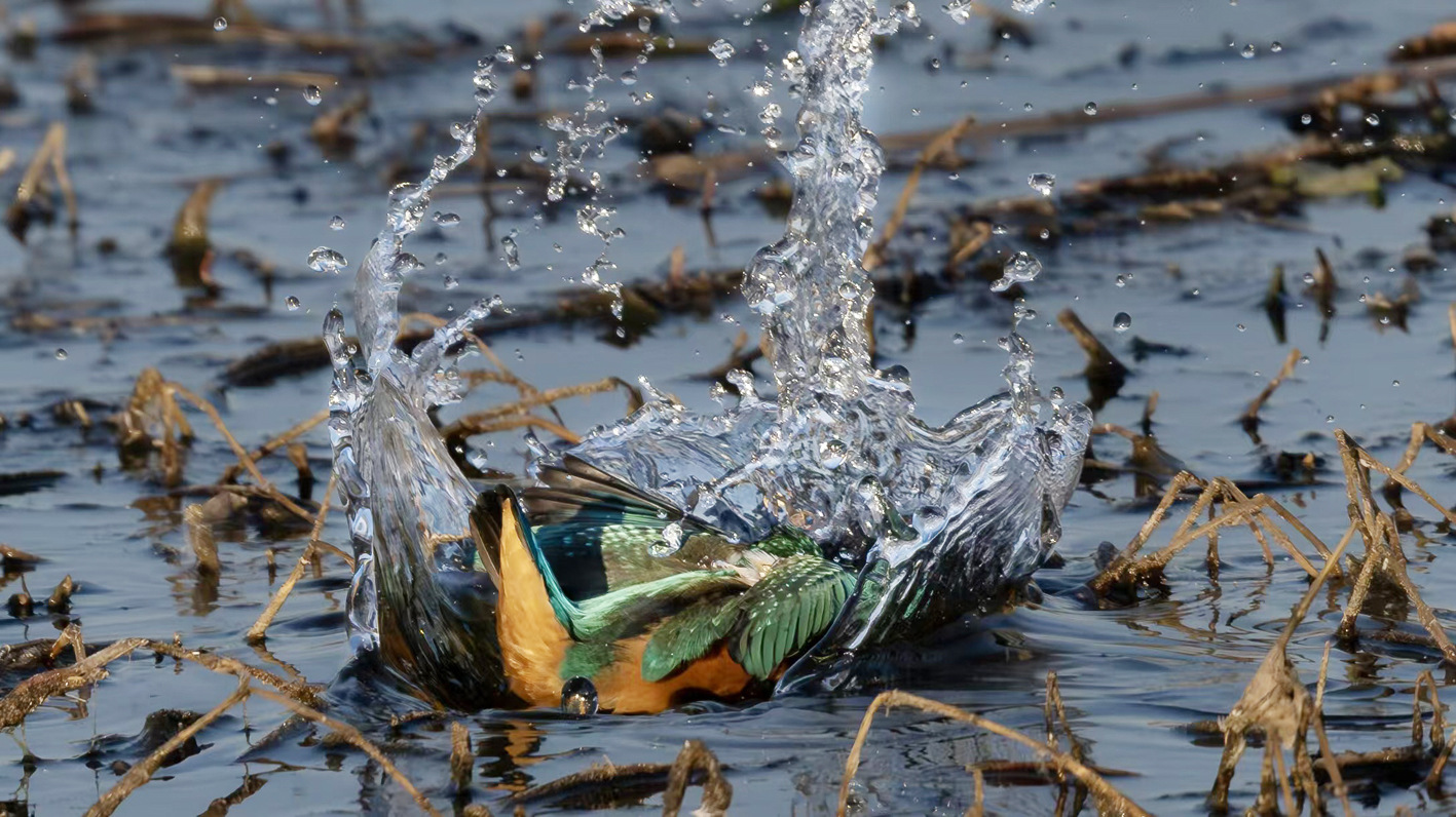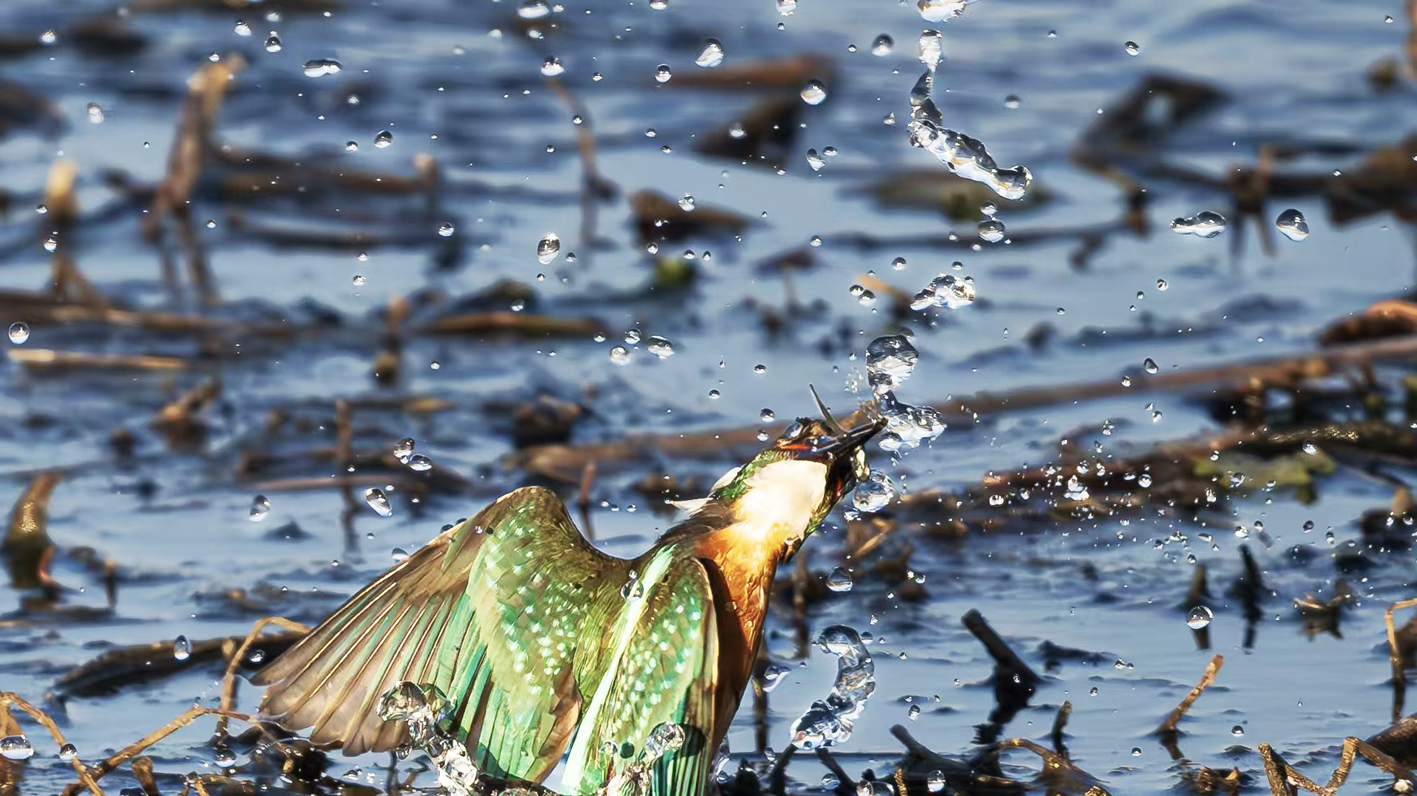 翠鸟,在我国多地都能见到它的踪迹,因其美丽的外观和独特的捕鱼方式而闻名。它背部是宝蓝色的外衣,中央还有一条明显的蓝带,腹部则是赤褐色,头部羽毛绣满翠绿色花纹,一双透亮灵活的眼睛下面长着一张为捕鱼而生的尖尖长嘴。它是大自然中的捕鱼高手,用它的行动展现着生命的活力与生存的智慧,也让我们更加深刻地感受到大自然的神奇与魅力。 王坤 崔根元 摄