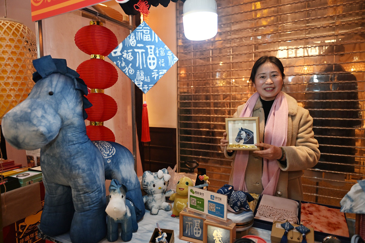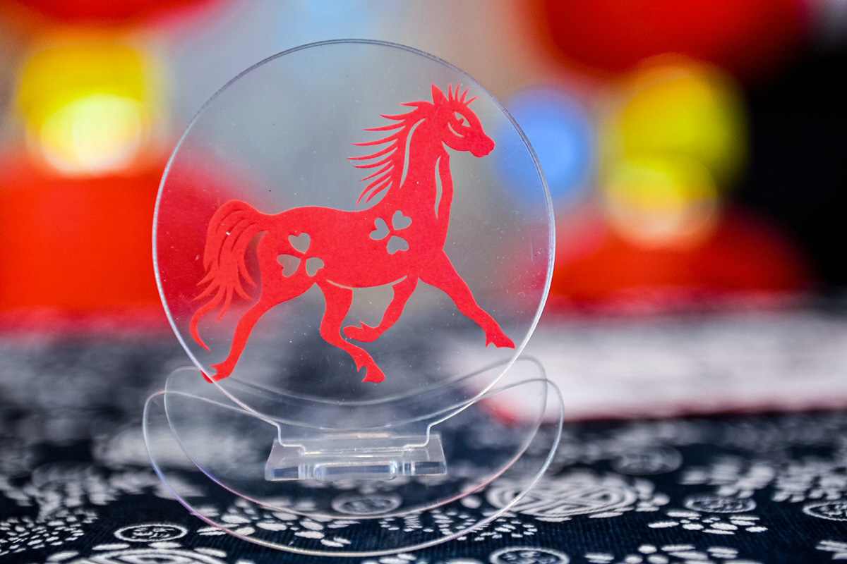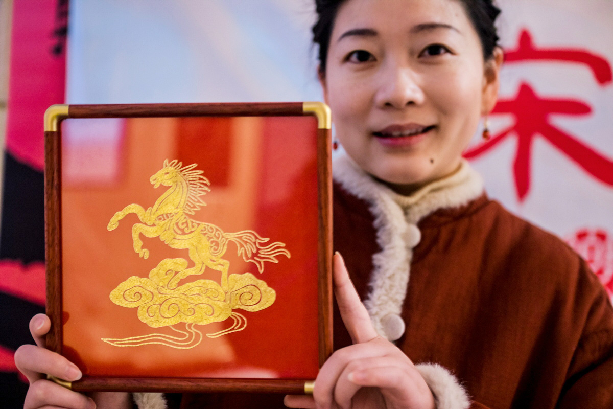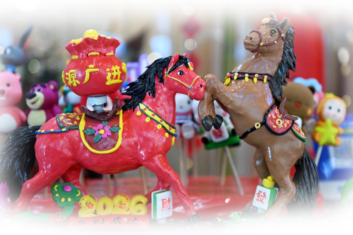 在传承人灵巧的双手中,古老的技艺被重新唤醒。晶莹剔透的糖画工艺,让骏马仿佛披着琥珀光华瞬间腾跃;柔软的面团被巧妙塑形,马的肌肉线条与飘逸鬃毛尽显灵动;纤薄的红纸经过精妙剪裁,化作轮廓分明、寓意吉祥的马影;雅致的印染布帛上,骏马纹样与如意云纹交织,流淌着古朴韵味;细密的刺绣针脚下,丝线流转,勾勒出马儿矫健的身影与华美的鞍辔纹饰……糖画、面塑、剪纸、印染、刺绣……传承人不仅精准捕捉骏马的奔腾姿态,更将“龙马精神”“马到成功”等祥瑞寓意,以及福字、如意等新年喜庆元素,巧妙地融入创作构思,共同谱写着一曲关于“马”的匠心颂歌。