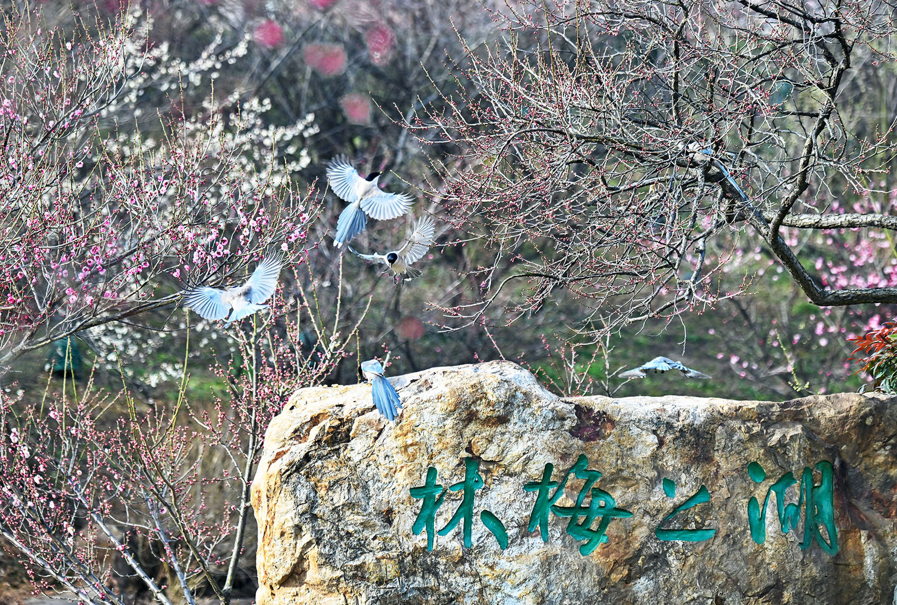 2月9日,扬州瘦西湖风景区内,蓝天白云映衬下,千株梅花次第绽放,粉白嫣红的花枝间,喜鹊灵动翻飞,构成一幅“鹊闹梅梢、春归湖畔”的诗意画卷,吸引众多游客驻足赏景。 高翔 司新利 摄