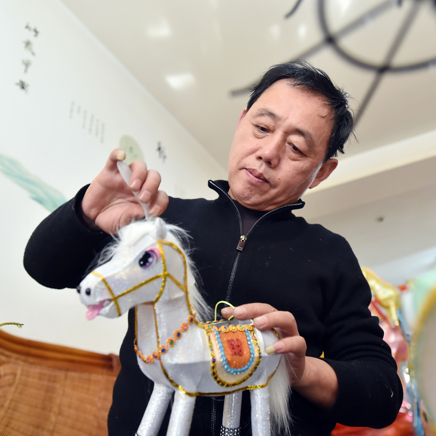 许根祥在给生肖马花灯“梳妆”。庄文斌 摄