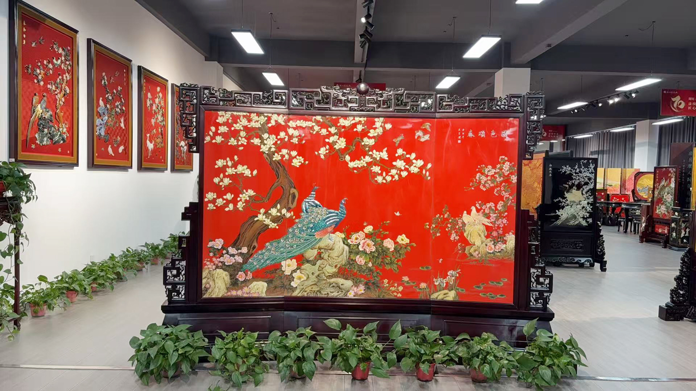 在扬州漆器厂,马年主题漆器精品展参展作品品类丰富,涉及点螺、雕漆嵌玉、平磨螺钿、刻漆、雕漆等工艺。