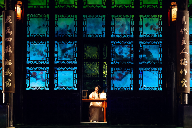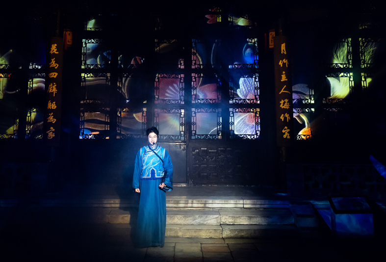 “何堂月色”夜演分为“不系之舟、四时风物、百年梦回、石叠沧溟、何园合缘”五大篇章,系统地对何园的建筑、历史、人文、文化进行场景化还原。50分钟的游览时长里,游客将在行进中沉浸式感受园林与人文的交融之美。