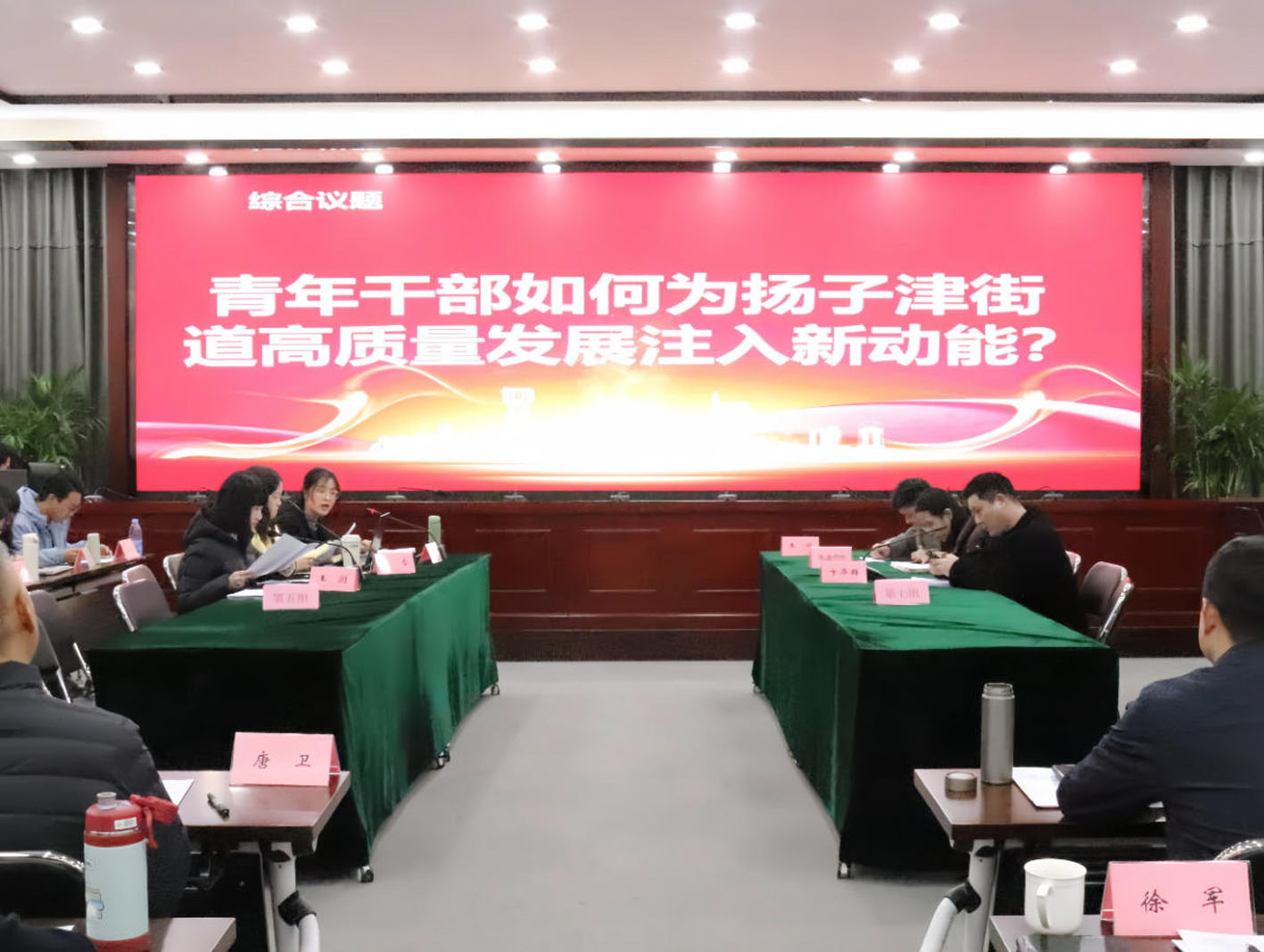 现场,30余名年轻干部组成10个学习小组,围绕营商环境、基层治理、法治建设、生态文明、智慧城市五大主题两两PK,并在终极对决环节直面同一道考题——“青年干部如何为扬子津街道高质量发展注入新动能?”10分钟现场准备,10分钟限时陈述,评委从思想高度、方案可行性、创新思维等维度严格打分。