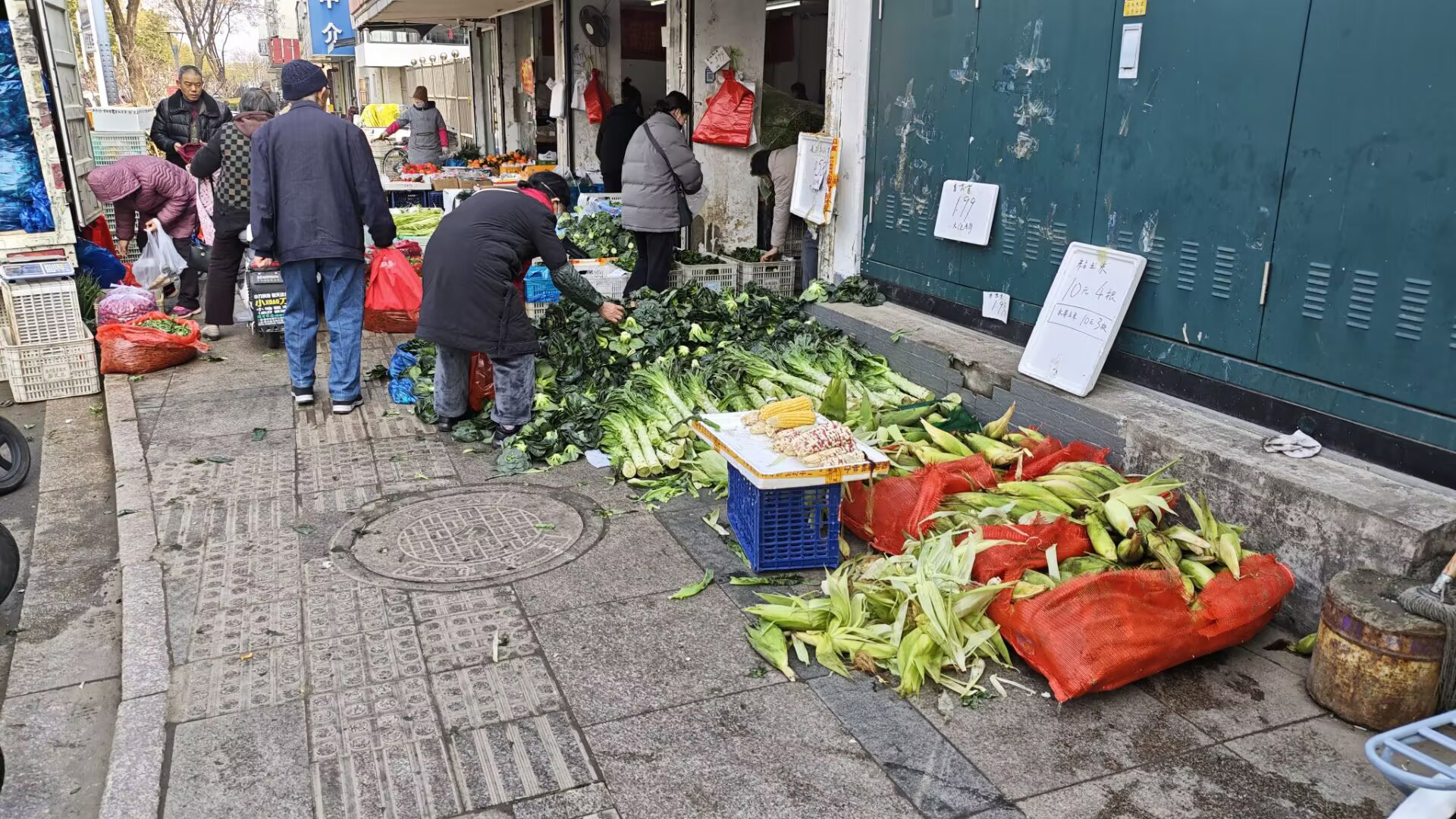 在现场记者看到,扬子江北路东侧上百米路段内,有多家沿街店铺存在出店经营的情况。其中,情况好一点的是炒货店,将商品摆放在店铺门前人行道上,占用了部分路面,行人通行时受到的影响不算很大;其余出店经营的店铺,都是经营农副产品和生鲜的,在这类店铺门前,摆放着大量的农副产品,占据了大部分人行道,加上有不少人挤在人行道上买东西,几乎将整个人行道挡住。记者看到,行人从这类店铺前经过时,要小心避让,有时甚至无法通行,只能走非机动车道。
