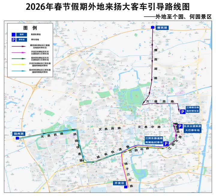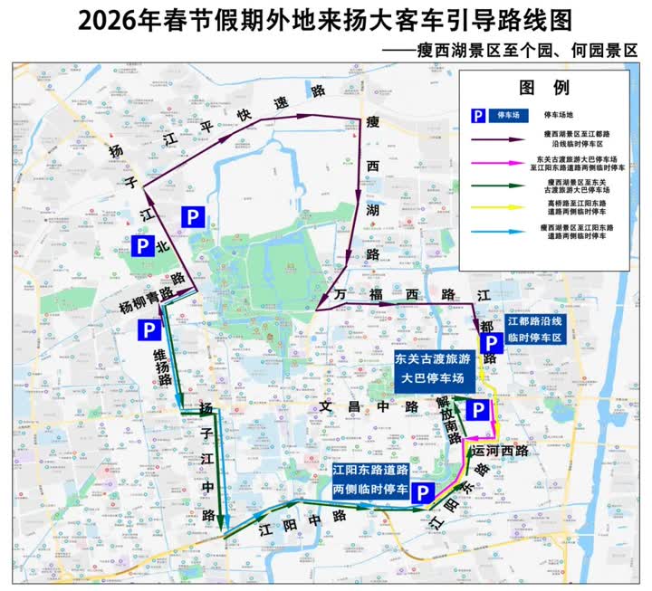 2.各停车场—扬子江北路—江平快速路—瘦西湖路—万福西路—江都路沿线临时停车区