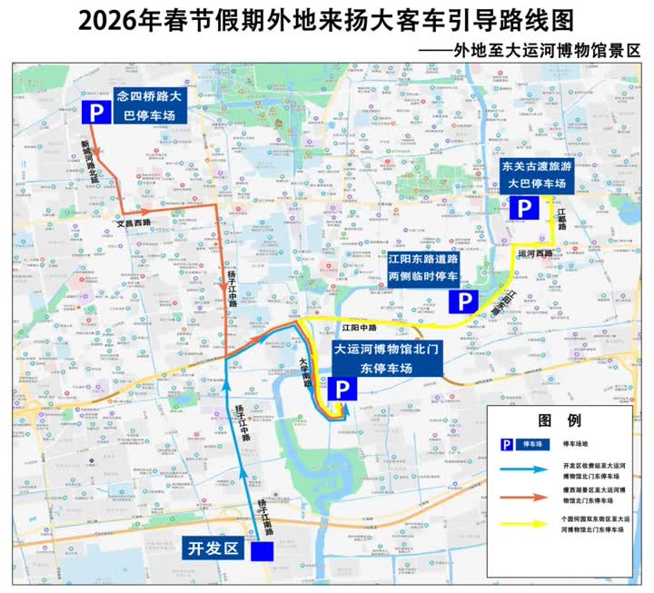 瘦西湖景区(念四桥路大巴停车场)—新城河路—文昌西路—扬子江中路—江阳中路—大学南路—开发东路—大运河博物馆北门东停车场(大学南路与开发东路交叉口以东200米道路北侧)