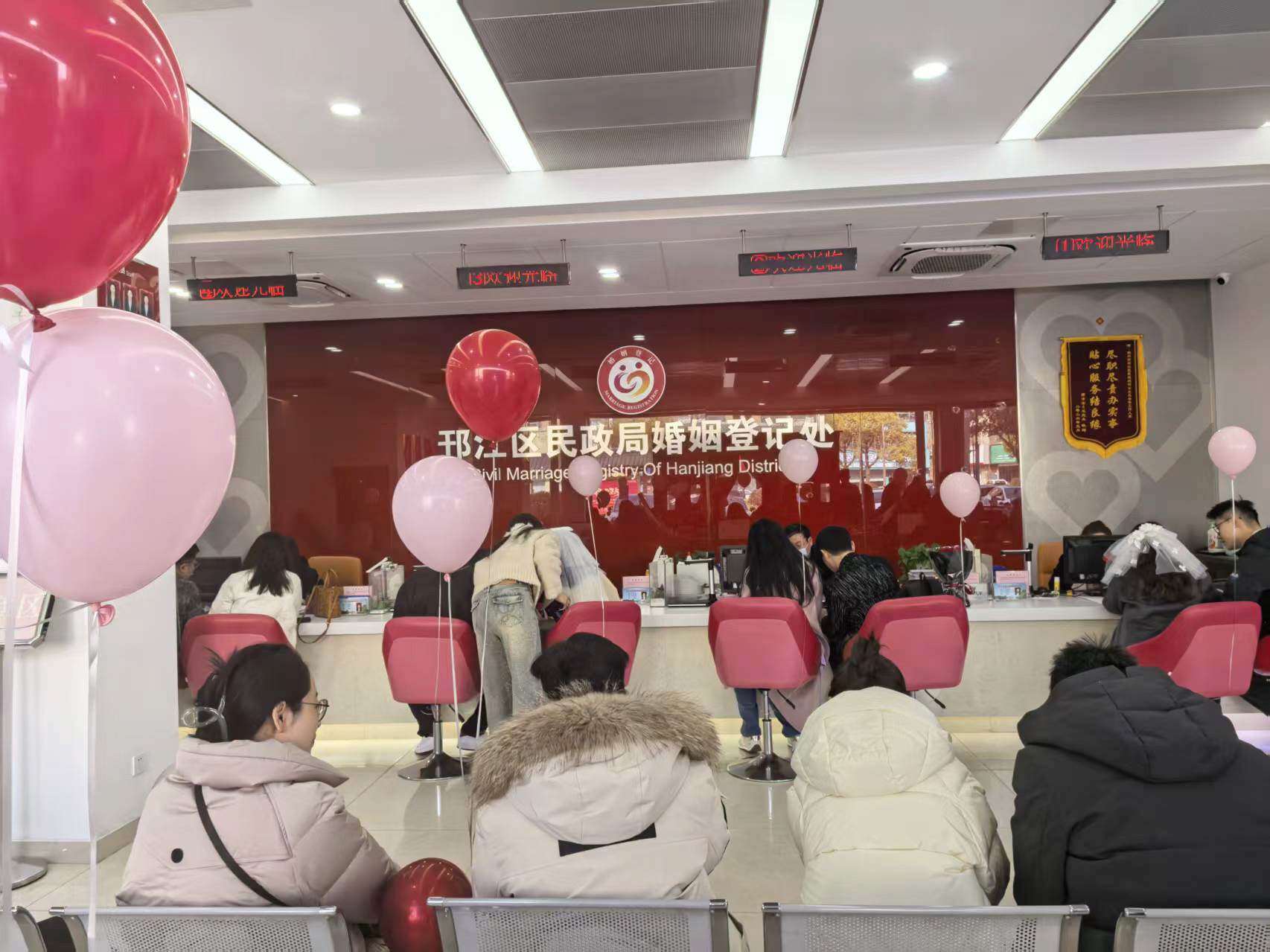 当天上午10时许,记者在邗江区民政局婚姻登记处登记大厅看到,计划在这里登记的新人井然有序,在工作人员的引导下,新人们高效有序办理结婚登记。
