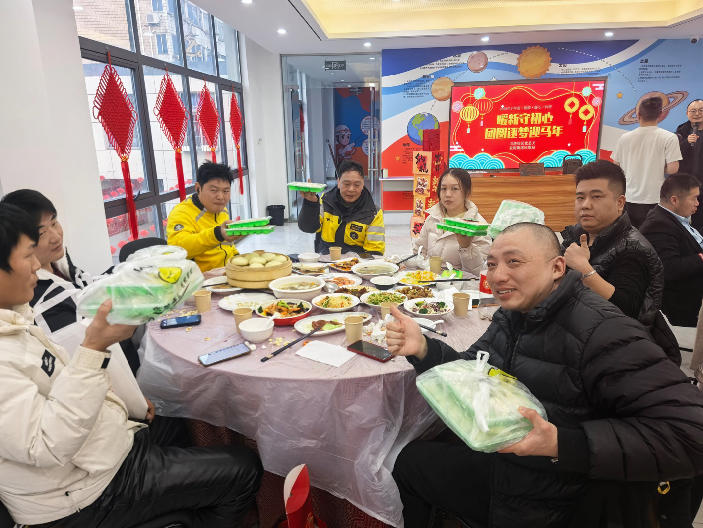 当天,石塔社区党总支邀请30名快递员、外卖骑手、网约车司机等新就业形态劳动者代表欢聚一堂,同吃暖心团圆饭。