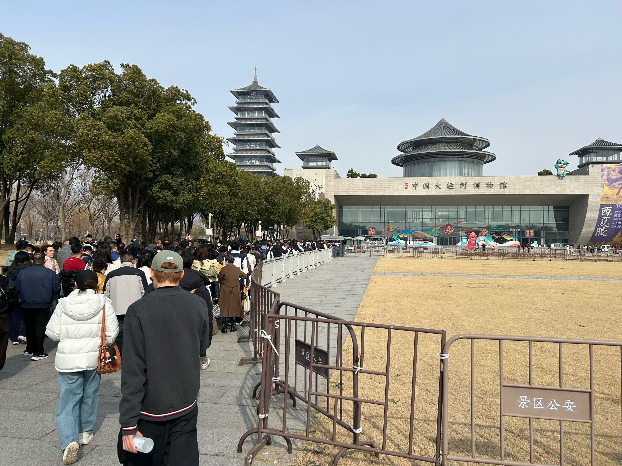 作为扬州文旅地标,扬州中国大运河博物馆前人气爆棚,前来参观游览的游客排起长龙,大家有序等候,只为沉浸式感受大运河的千年底蕴。博物馆门前的广场上,经典扬剧精彩开演,婉转的唱腔、优美的身段,尽显非遗戏曲魅力,吸引众多游客驻足聆听、拍照留念,传统民俗与运河文化相映成趣,为新春佳节增添了浓郁的文化气息。