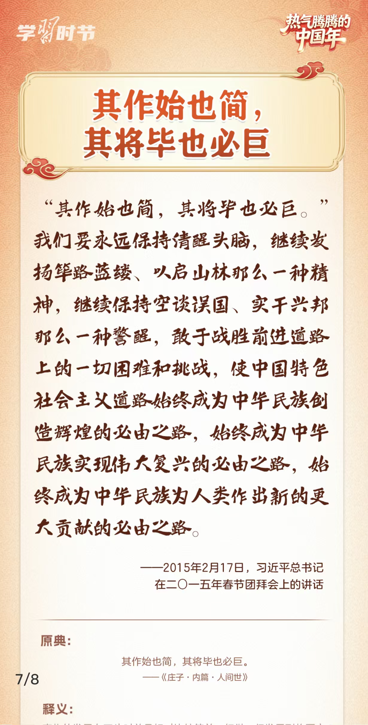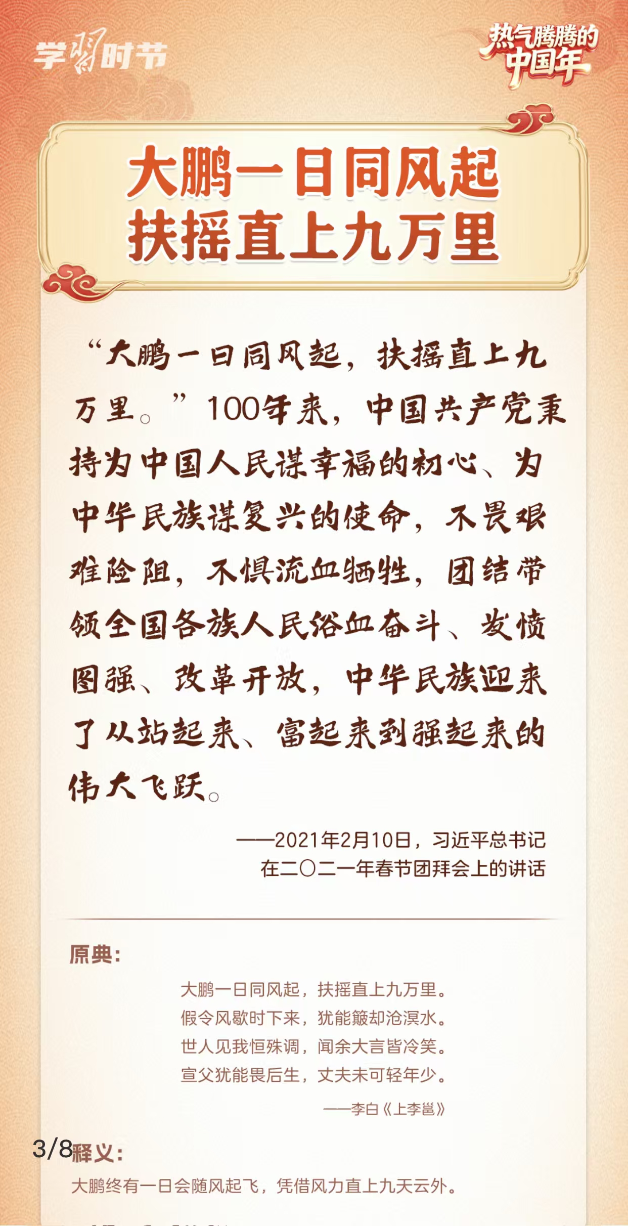 “在中国式现代化新征程上策马扬鞭、勇往直前,共同开创更加美好的未来。”2月14日,在二〇二六年春节团拜会上,习近平总书记的重要讲话振奋人心。党的十八大以来,习近平总书记多次在春节团拜会上发表重要讲话,回望旧岁、展望新年,向大家致以美好的新春祝福。在讲话中,习近平总书记常常巧妙引用古典名句砥砺人心,指引我们脚踏实地、锐意前行,提醒我们珍视亲情、涵养孝道。一起来学习感悟。