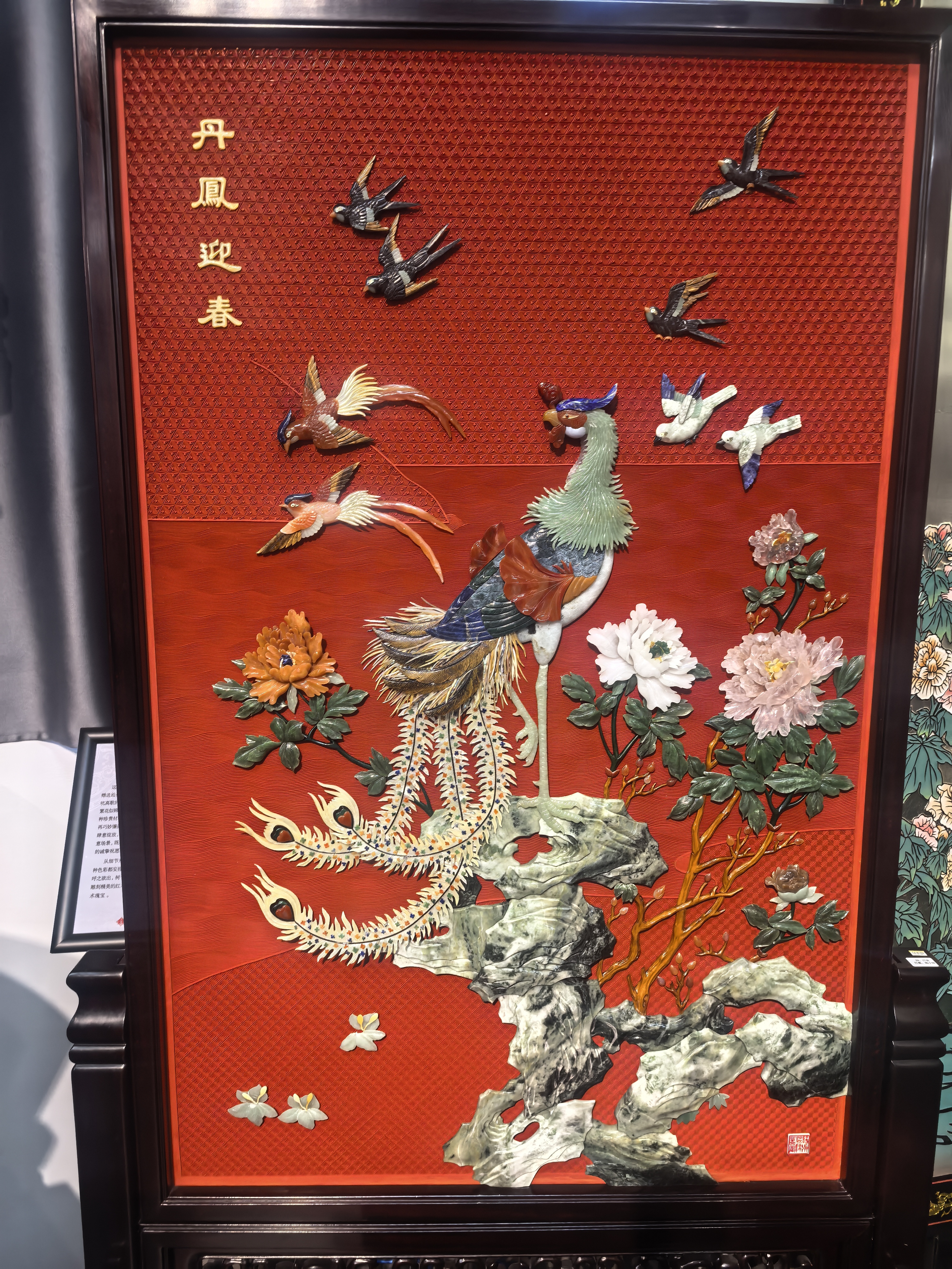 国礼雕漆嵌玉《丹凤迎春》地屏匠心独运,以振翅翱翔、引吭高歌的凤凰作为核心意象,生动勾勒出一幅生机勃勃、繁花似锦的春日盛景。精选翡翠、珊瑚、白玉、青金等十多种珍贵材料,将其雕琢成雍容华贵的牡丹和灵动的凤凰,再巧妙镶嵌于雕漆锦纹之上。色彩艳丽的牡丹,在画面中肆意绽放,与凤凰相互映衬,既洋溢着浓浓的春日气息,又寄托了对美好生活的诚挚祝愿。