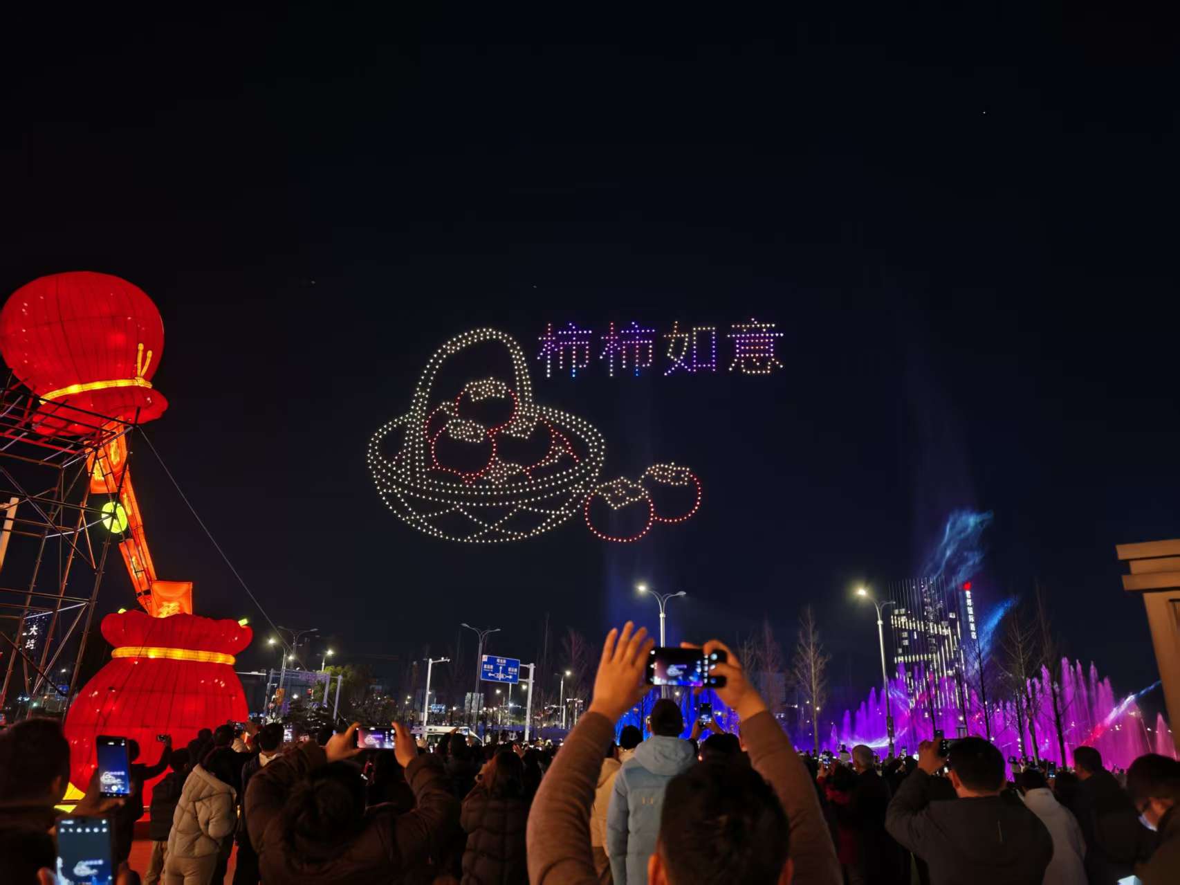 随后,“柿柿如意”竹编果篮图案登场,饱满的红柿配以暖色灯光,传递新春祝福。