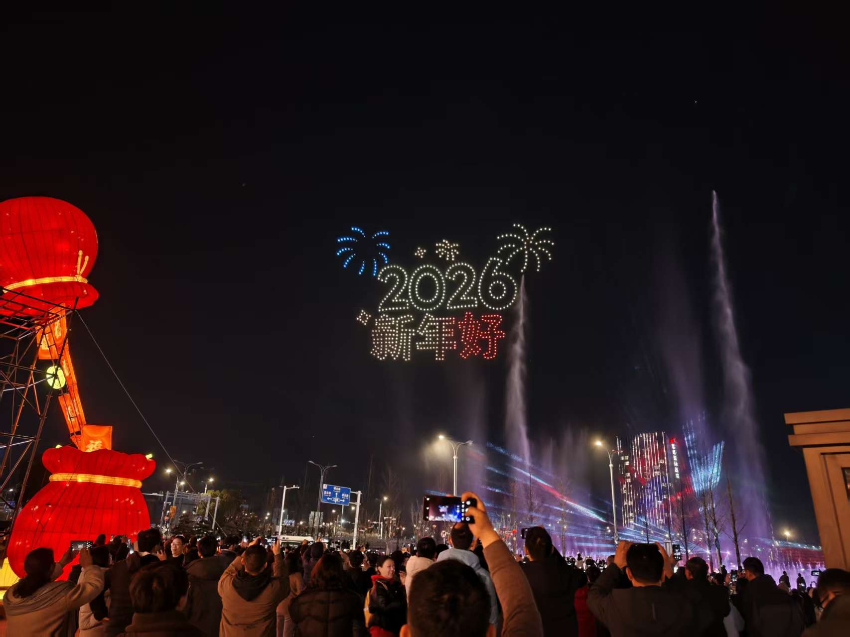 表演持续进行。“2026”字样配合礼花图案在空中绽放,表达辞旧迎新之意;