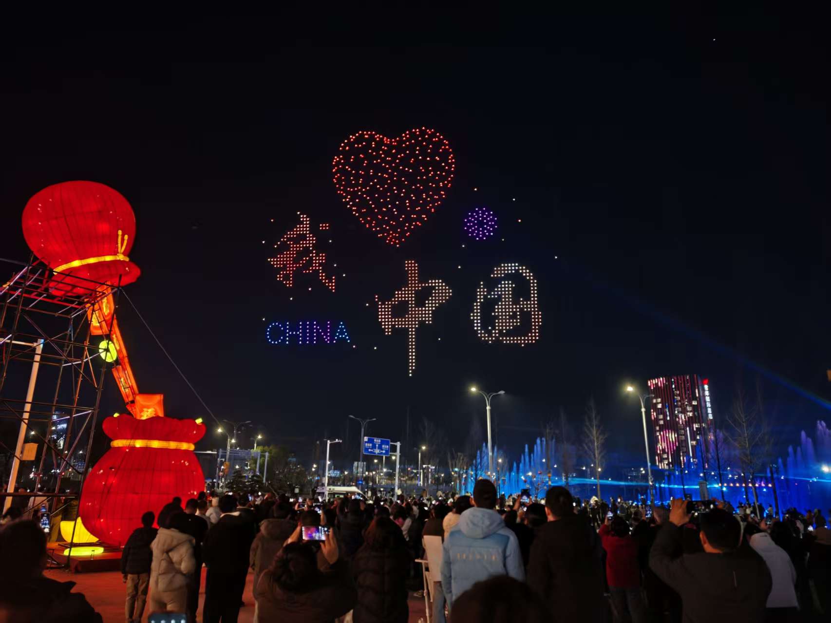 晚上7时30分,记者在现场看到,千架无人机如繁星般缓缓升空,在夜幕中排列成第一个画面——“我爱中国”。红色灯光组成的爱心简洁有力,引得现场观众纷纷举起手机。带着全家前来观看的市民陈先生说:“用这种方式表达对祖国的热爱,很震撼。”