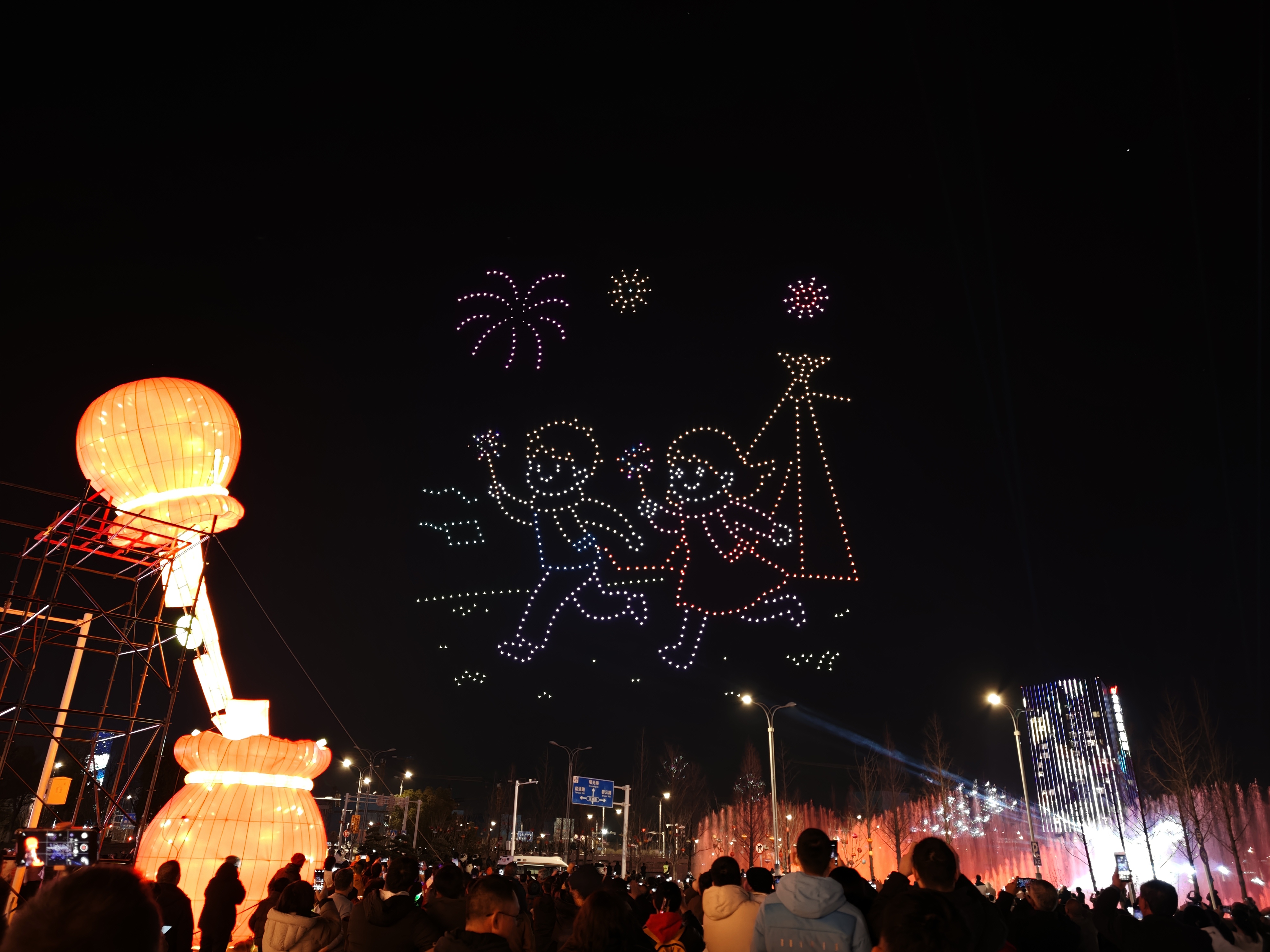 “表演很精彩,每个画面都很有意义。”从南京回扬州过年的刘先生带着孩子全程观看,“孩子一直仰着头看,说这是见过的最大的‘烟花’。”
