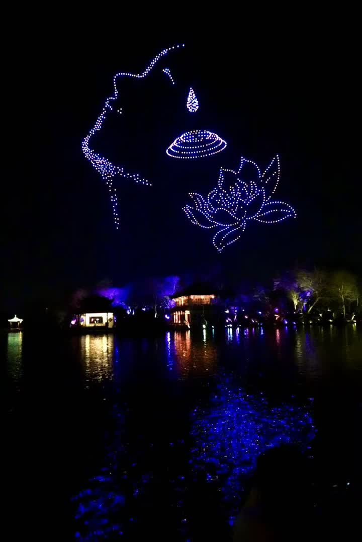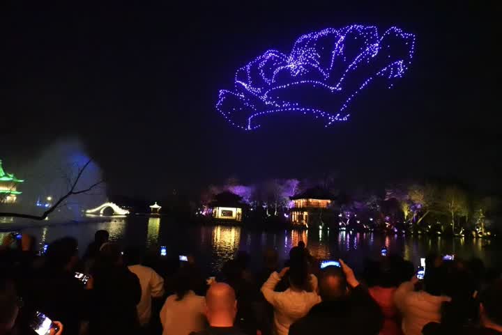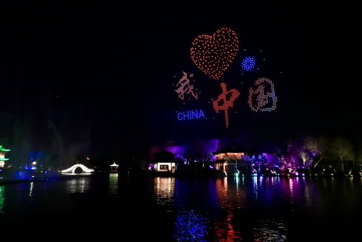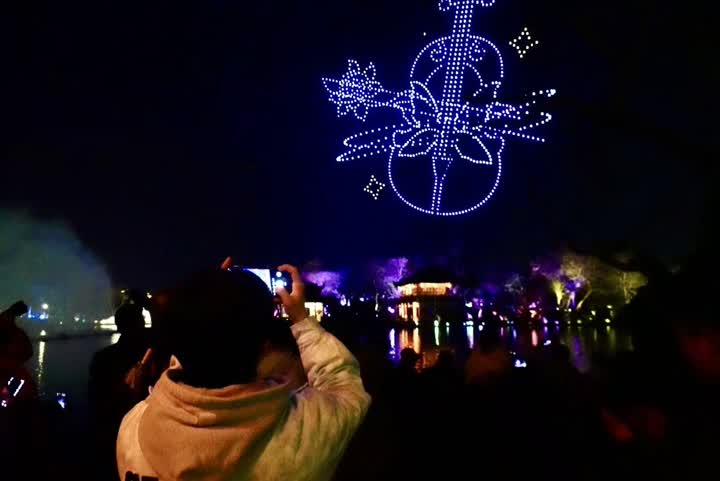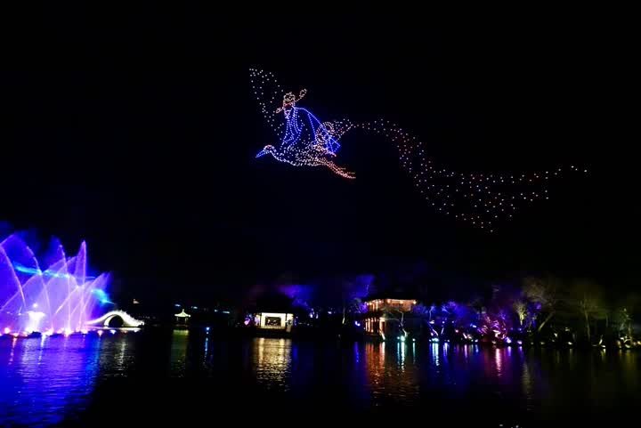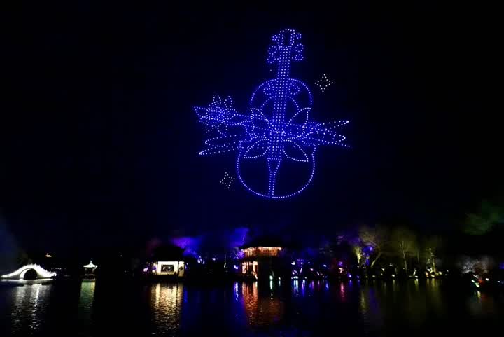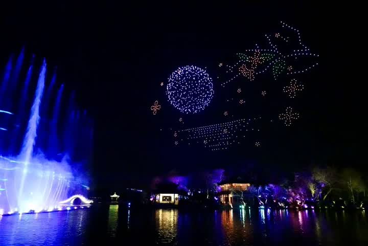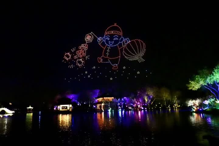 2月21日晚8时30分,无人机灯光秀在扬州瘦西湖上空精彩上演,为期五天的新春展演画上圆满句号。