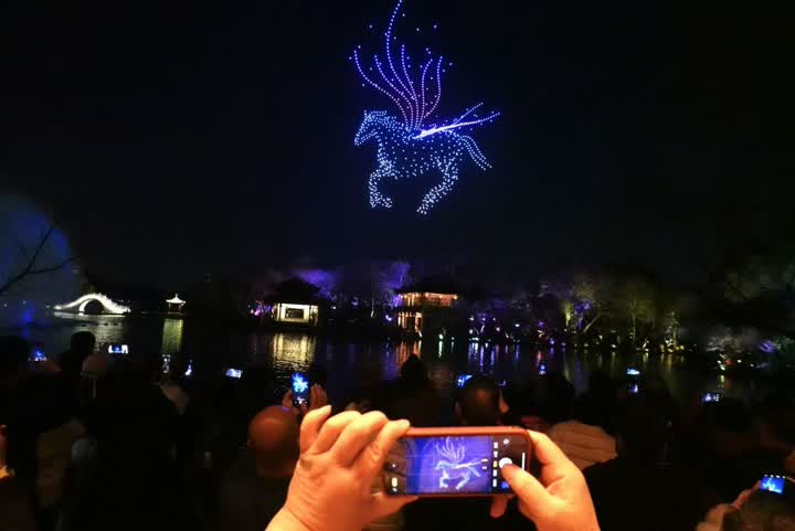 2026架无人机编队凌空起舞,以夜空为幕、灯光为笔,依次呈现五亭桥、古运河、琼花、淮扬美食、骏马奔腾等画面,将扬州文化符号与马年新春元素巧妙融合。炫酷光影与湖畔夜景交相辉映,吸引众多市民游客驻足观赏、拍照留念,尽显古城年味与科技魅力。