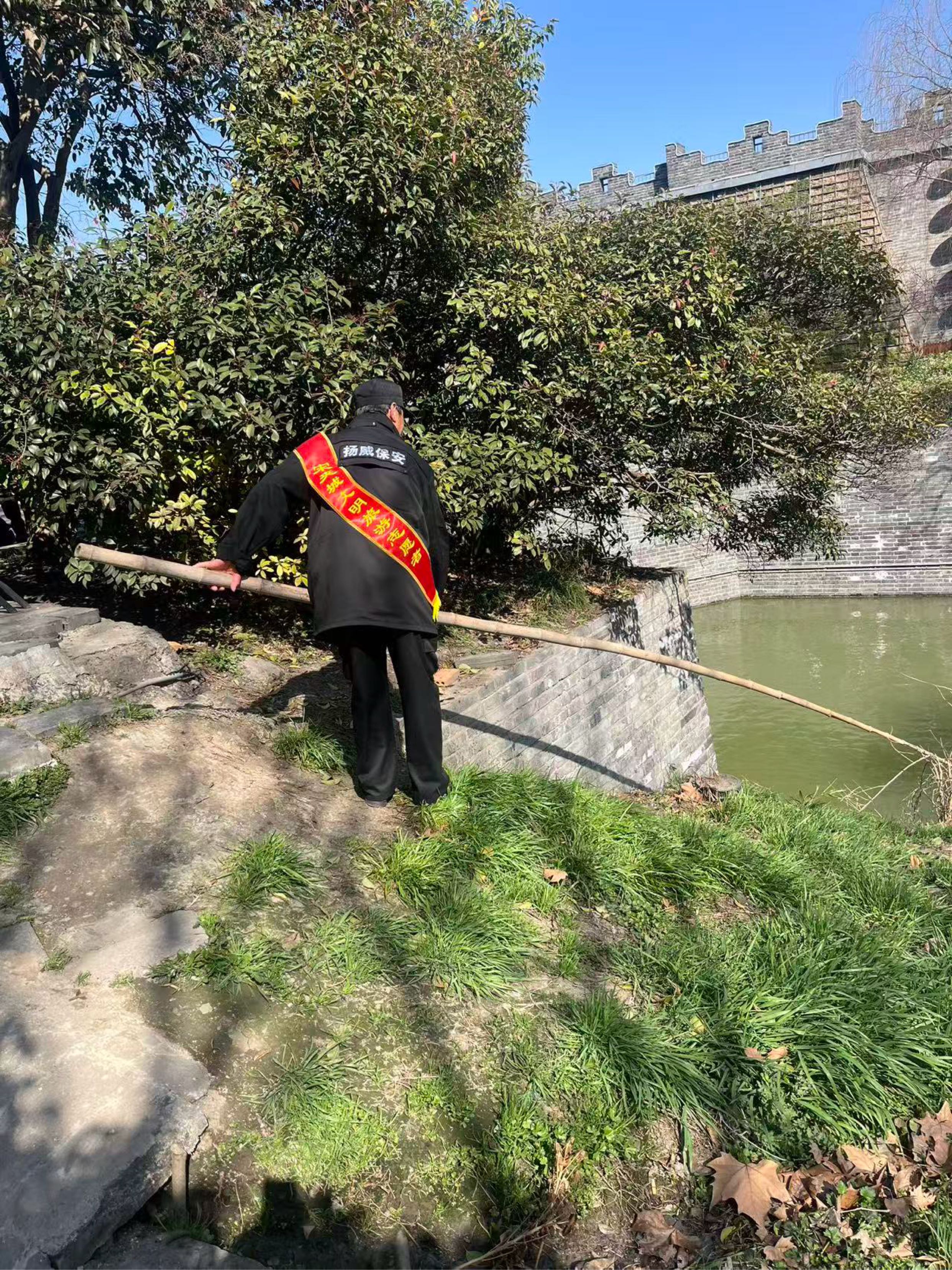 就在他们一筹莫展之际,正在执勤的宋夹城保安人员黄湖太主动伸出了援手。由于桥面距离水面较高,无法直接捞取,黄湖太积极想办法,找到一根长长的竹竿。他注意到帽子正顺着水流缓缓向前漂去,瞅准时机,稳稳地将帽子从水中挑了上来。见掉落水中的帽子失而复得,那份喜悦瞬间冲淡了游客之前的焦虑。见帽子湿透无法佩戴,黄湖太主动提出帮忙晾晒,待游客在宋夹城游玩结束再来领取。