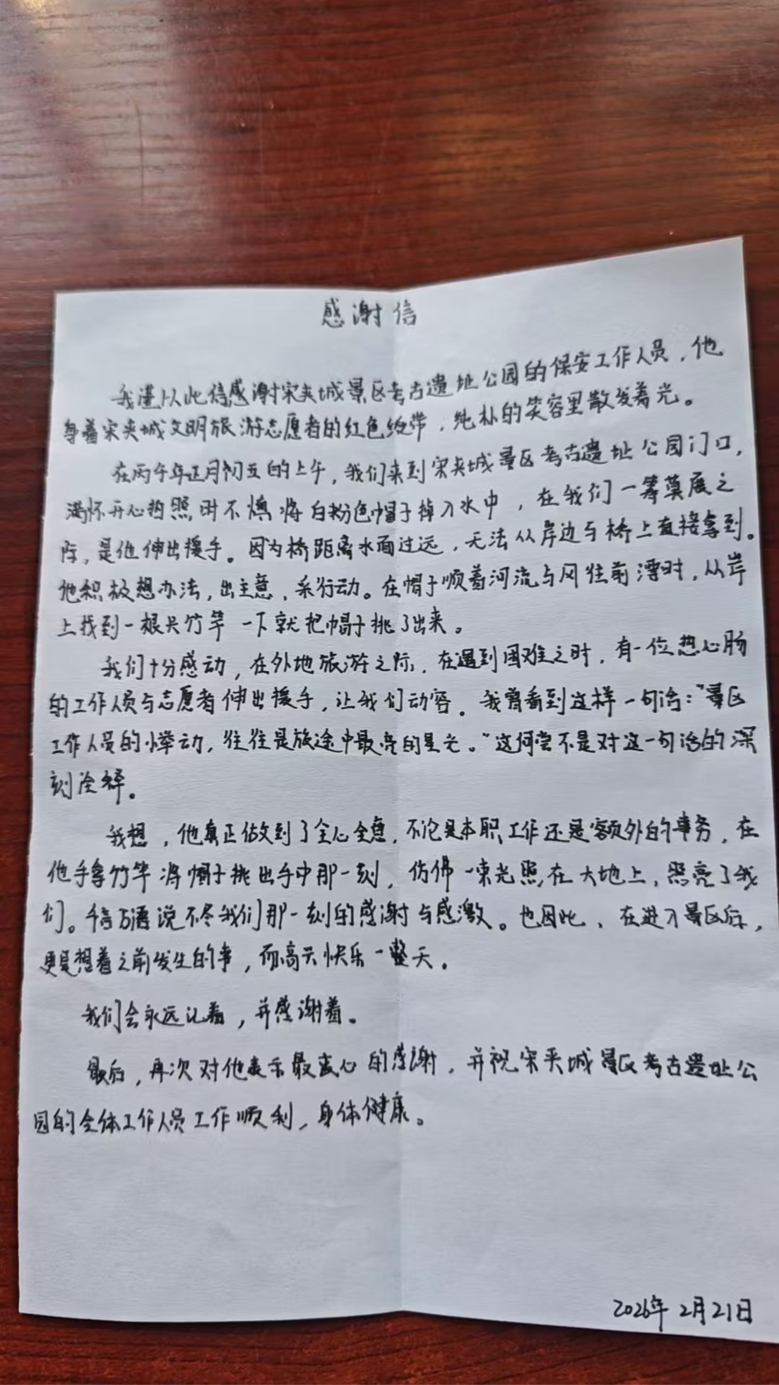 “我们万分感动,在外地旅游之际,在遇到困难之时,有位热心肠的工作人员伸出援手,让我们动容。”2月21日,一位外地游客将一封手写感谢信送到了宋夹城西门保安亭,字里行间饱含着对一位普通保安的深深谢意和对扬州这座有爱之城的点赞。