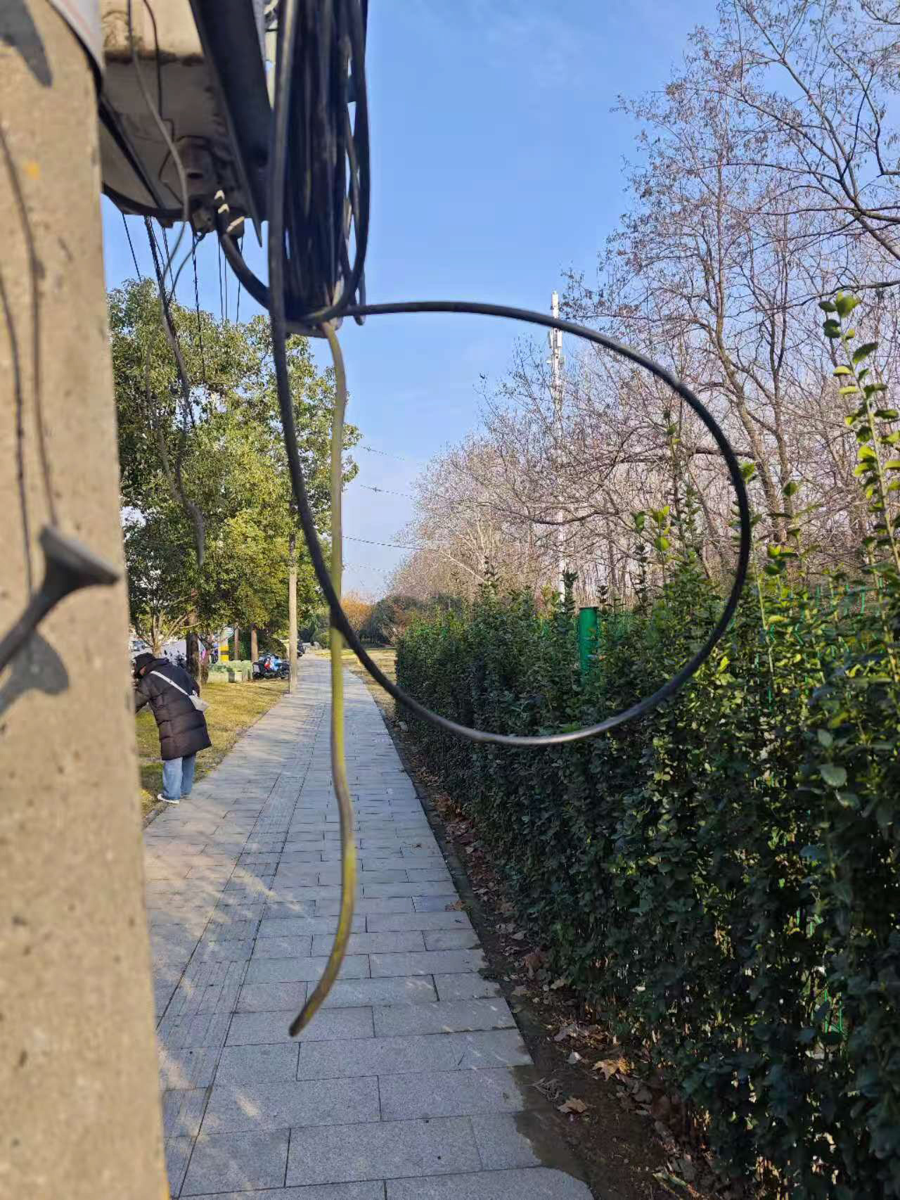 网友告诉记者,春节假期,他带着家人去蜀冈西峰游玩,看到了这处“圈套”。“可能是线缆的扎带松动了,掉了一圈下来,正好拦在路上,看起来像是套兔子的‘圈套’。如果有路人不小心,可能会被勒住脖子。”网友希望相关部门把这段线缆整理一下,不留隐患。