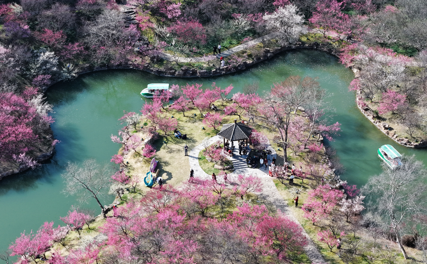 早春时节,瘦西湖风景区“湖上梅林”的梅花竞相绽放,灿若烟霞,吸引众多市民游客前来赏花游玩。孟德龙 摄