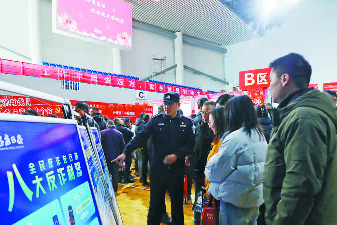 2月22日,江苏省宝应县公安局刑侦大队民警走进宝应县新春大型人力资源招聘洽谈会现场,结合当前反诈工作重点以及求职旺季、务工人员流动等情况,通过讲解真实诈骗案例等方式,向广大求职者宣讲反诈知识。