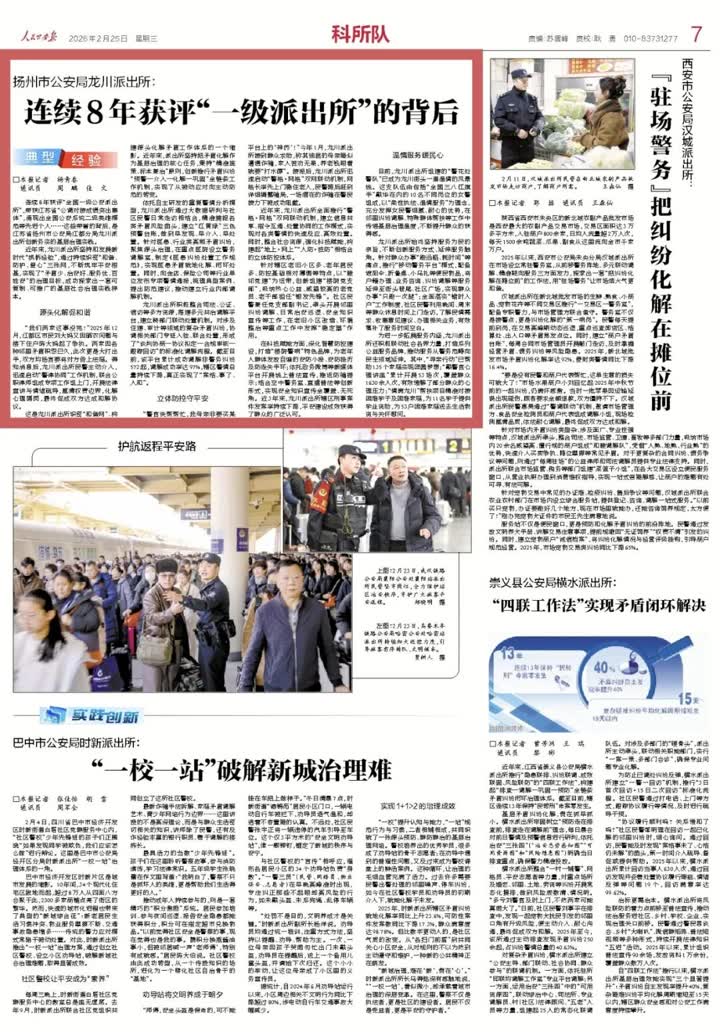 连续8年获评“全国一级公安派出所”,荣获江苏省“公调对接成绩突出集体”,涌现出全国公安系统二级英雄模范等先进个人……这些荣誉的背后,是江苏省扬州市公安局江都分局龙川派出所创新务实的基层治理实践。