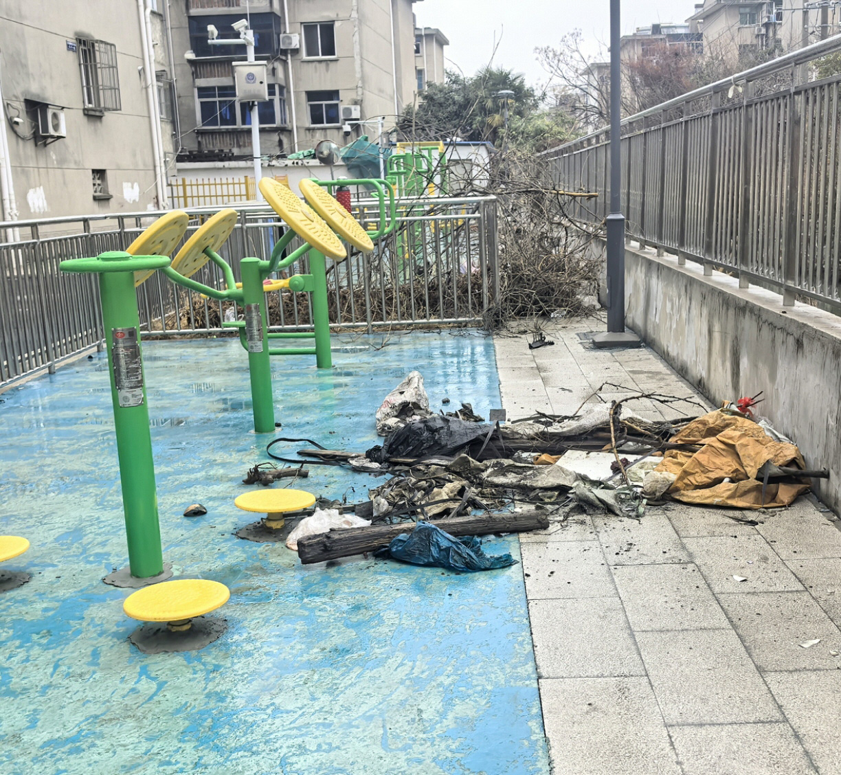 侯女士介绍,小区东边楼栋旁的空地上有一处健身广场,场地上有多件健身器材,每天有不少居民在此健身锻炼。健身器材旁有一条小河,通往小区外,小区内的一段河道被居民丢了不少垃圾,河面还有一些枯树枝,看起来脏乱差,需要清理。