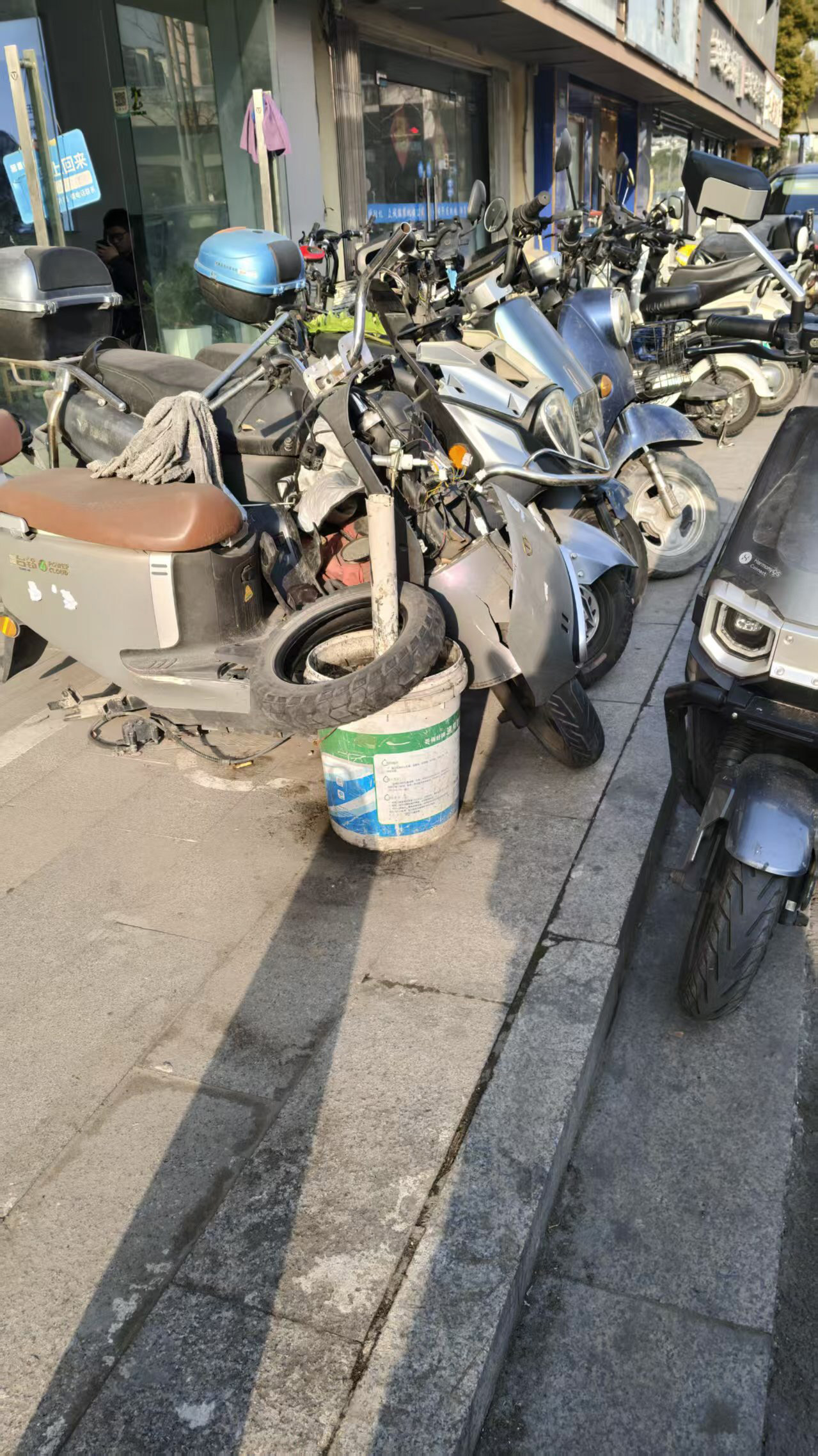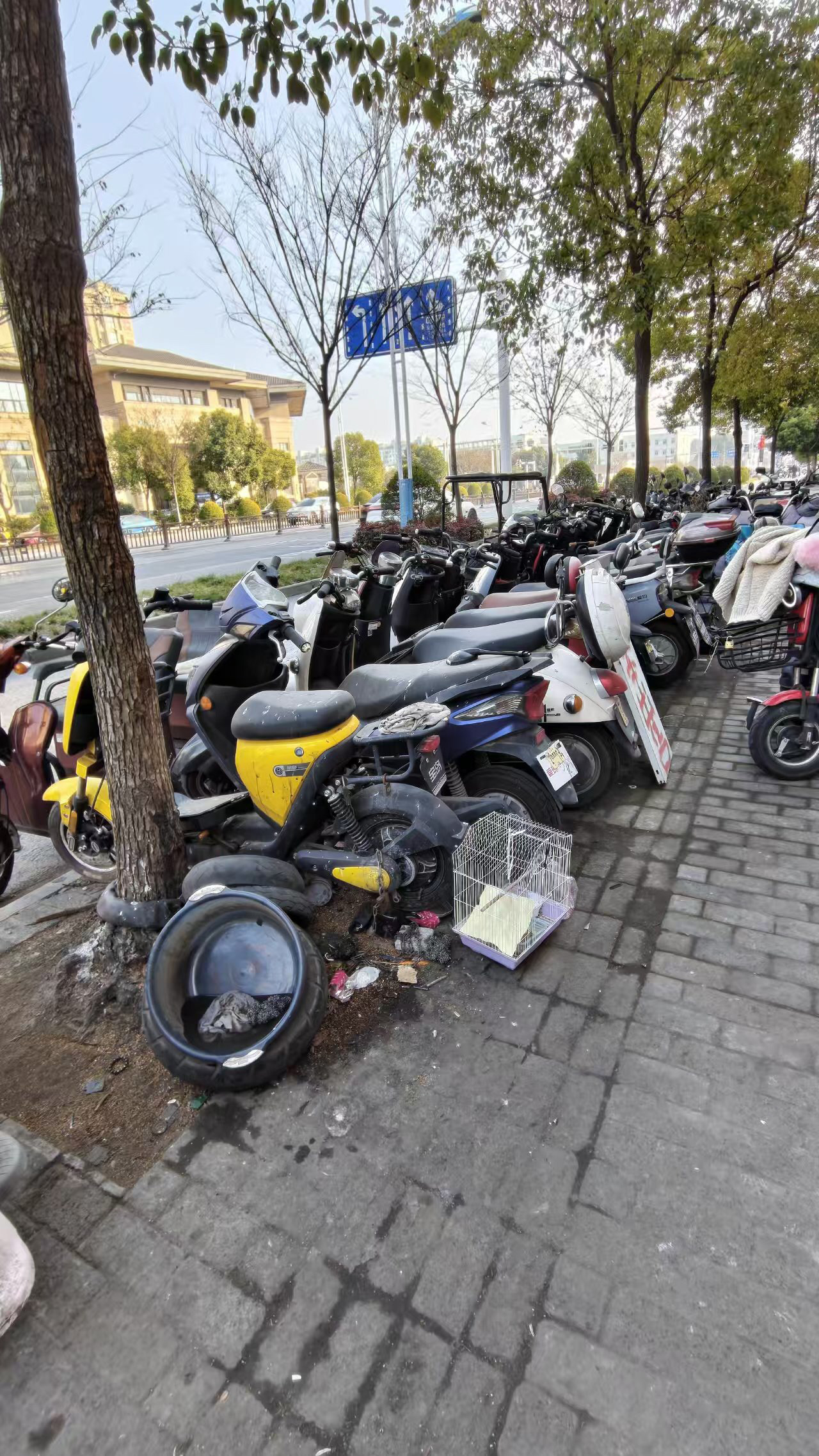 春节前,记者来到五台新村小区、铭悦府小区附近的江都北路探访,看到周边也有做电动车销售的商铺。记者仔细观察发现,商铺门前环境也不清爽,有商家停放废旧电动车,个别车辆“缺胳膊少腿”,市民步行经过都要绕开。此外记者还看到,商家还在店外维修、处理电动车,零部件及废旧轮胎等随意放在店外,甚至放在附近树池。