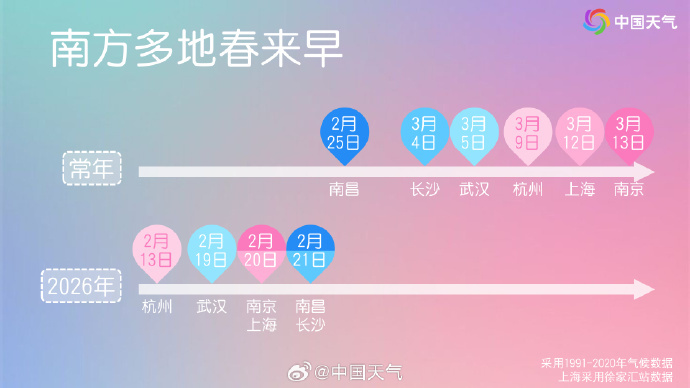 交汇点讯 2月27日,中国天气网发布消息称:近期,根据连续五天滑动平均气温高于10℃的标准,南方大城市中,杭州、武汉、南昌、南京、上海、长沙今年都已经进入气象意义上的春天。加上已经入春的成都和杭州,南方今年的春天普遍提前“报到”!小伙伴们,你们的春天来了吗?