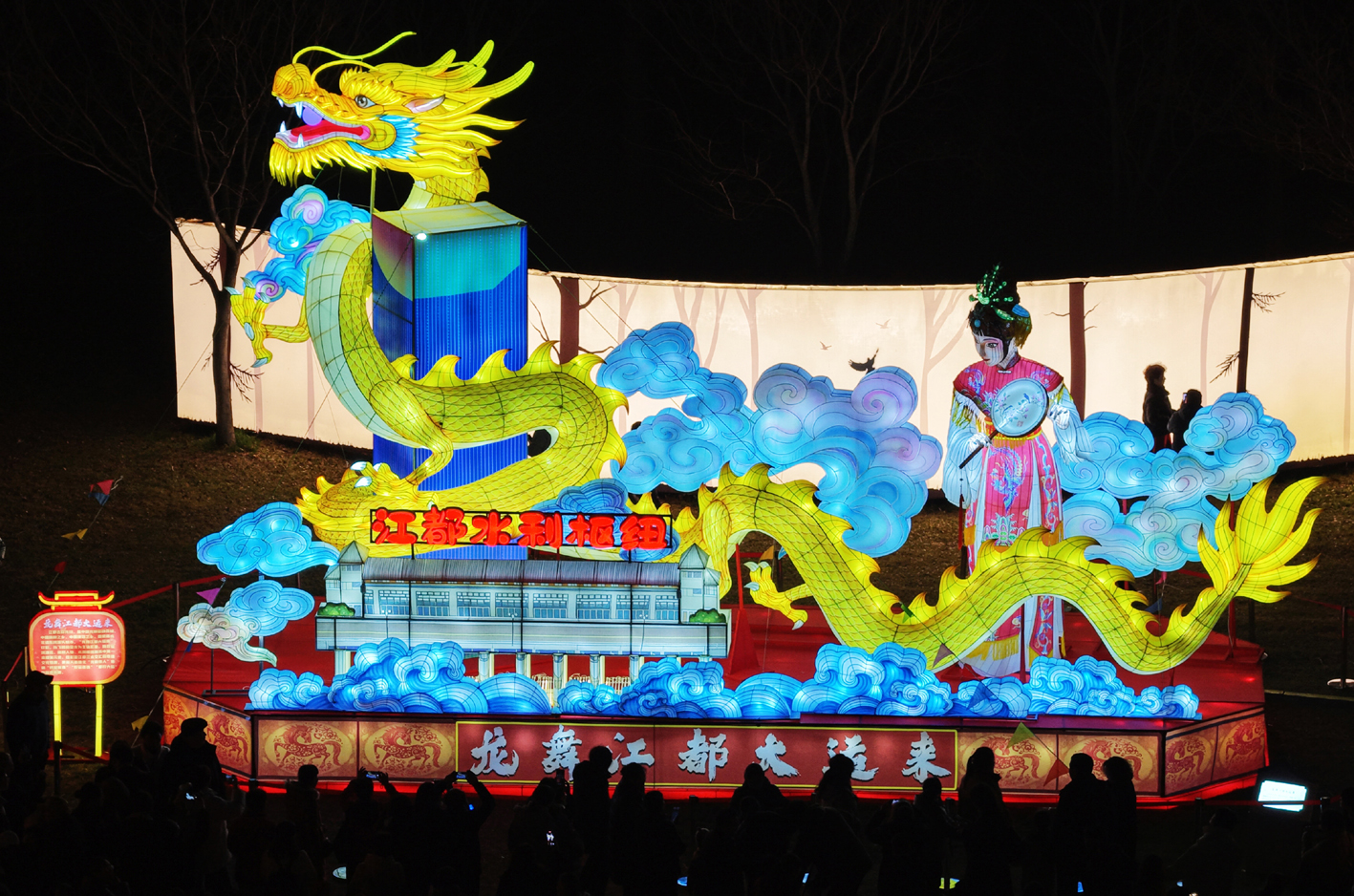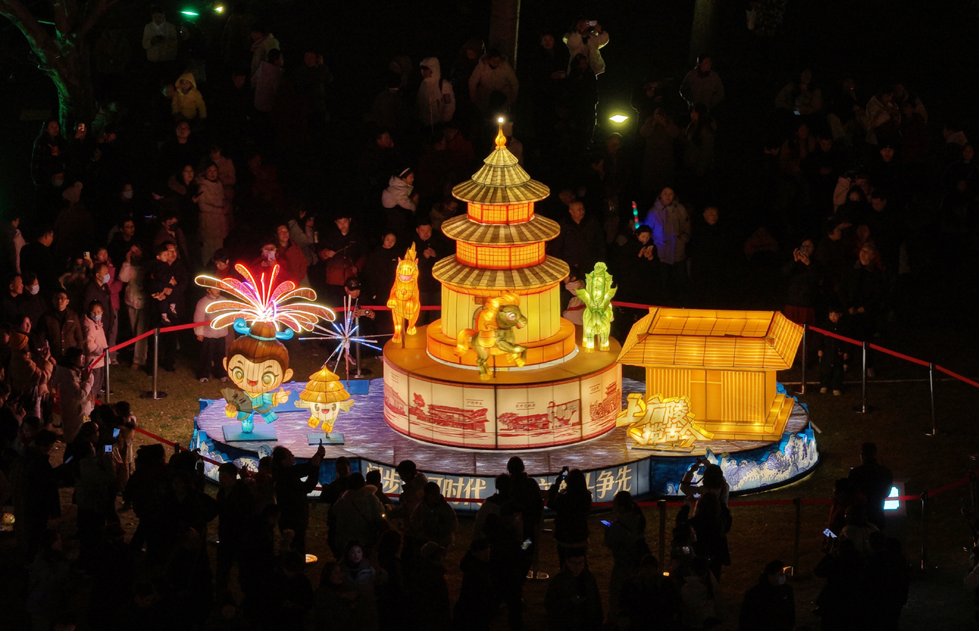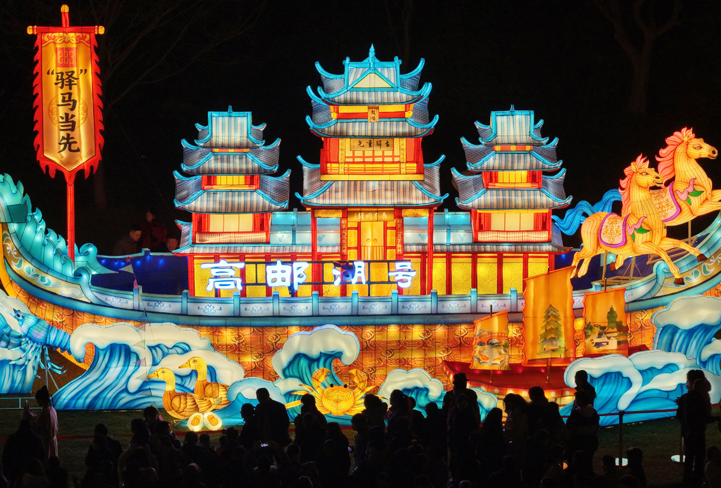 位于十字街中心广场的主灯“运河灯影·马跃春台”尤为吸睛,灯组高8.5米,整体采用跑马灯形制设计,第一、二层以“运河十二景”为设计核心,光影流转间尽览古城新貌,灯组之上瑞马昂首扬蹄、身姿矫健,寓意扬州将以昂扬向上的姿态、勇毅前行的步伐,聚万众之力、建“万亿之城”。