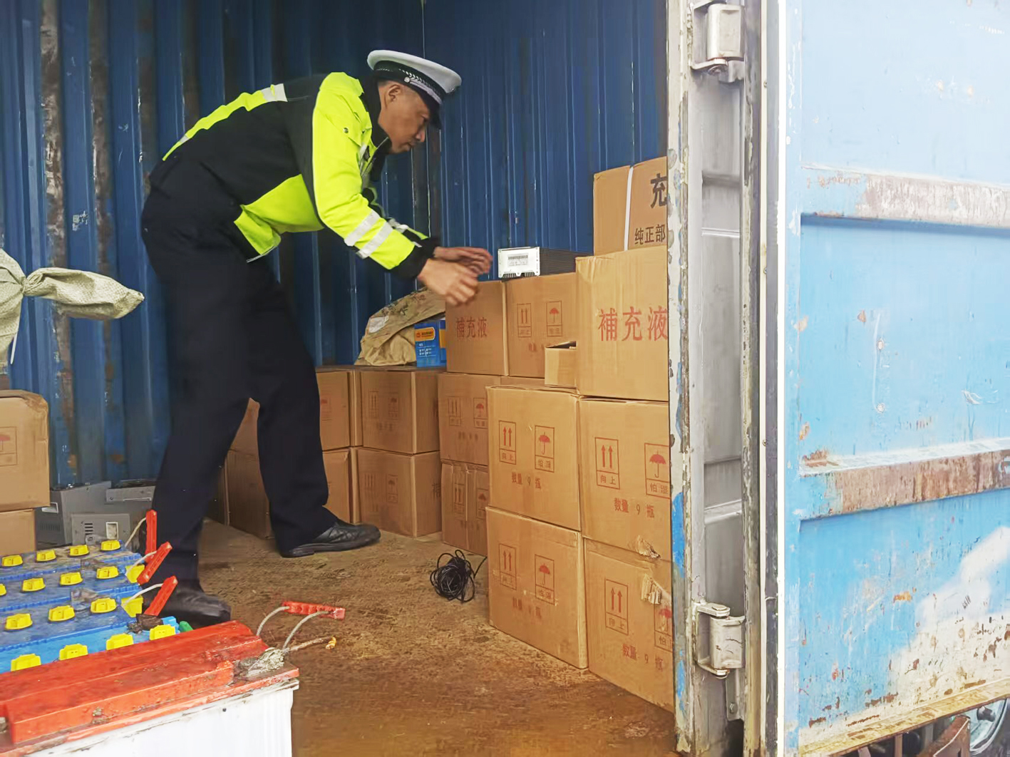 在民警要求下,驾驶人打开车厢,车内装载了大量的电瓶。随后,交通部门执法人员也来到了现场。经证实,这些电瓶是危险品,而这辆轻型货车并没有运输危险品的资质。