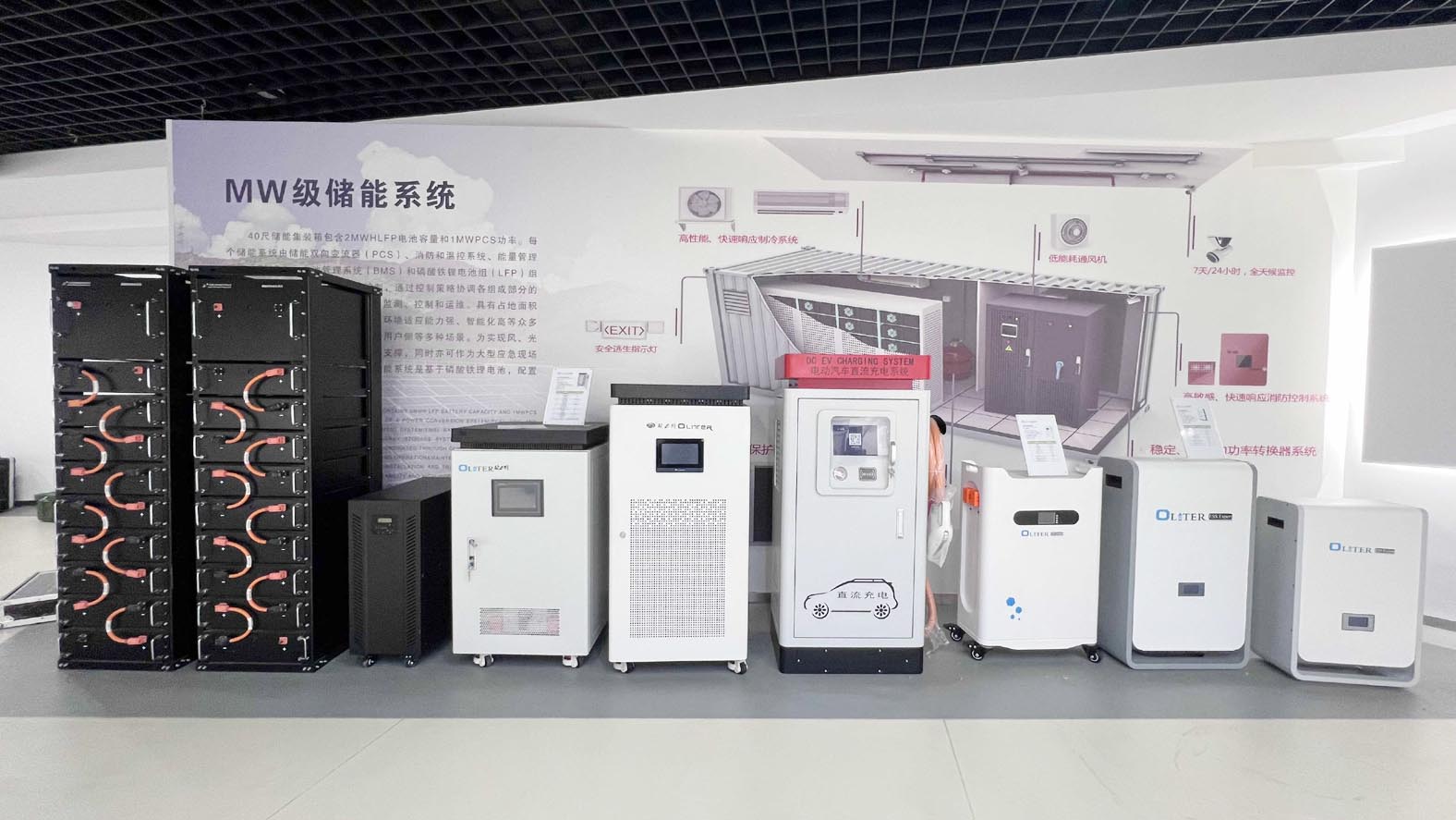 在厂区一块空地上,有一台硕大的集装箱式设备,里面是锂电储能系统,与旁边的车棚顶光伏电池面板配套,形成“光伏发电+储能的系统集成+充电桩+备用电源”。这是欧力特科技新研发的微电网/智能电网储能一体化系统项目的应用场景。