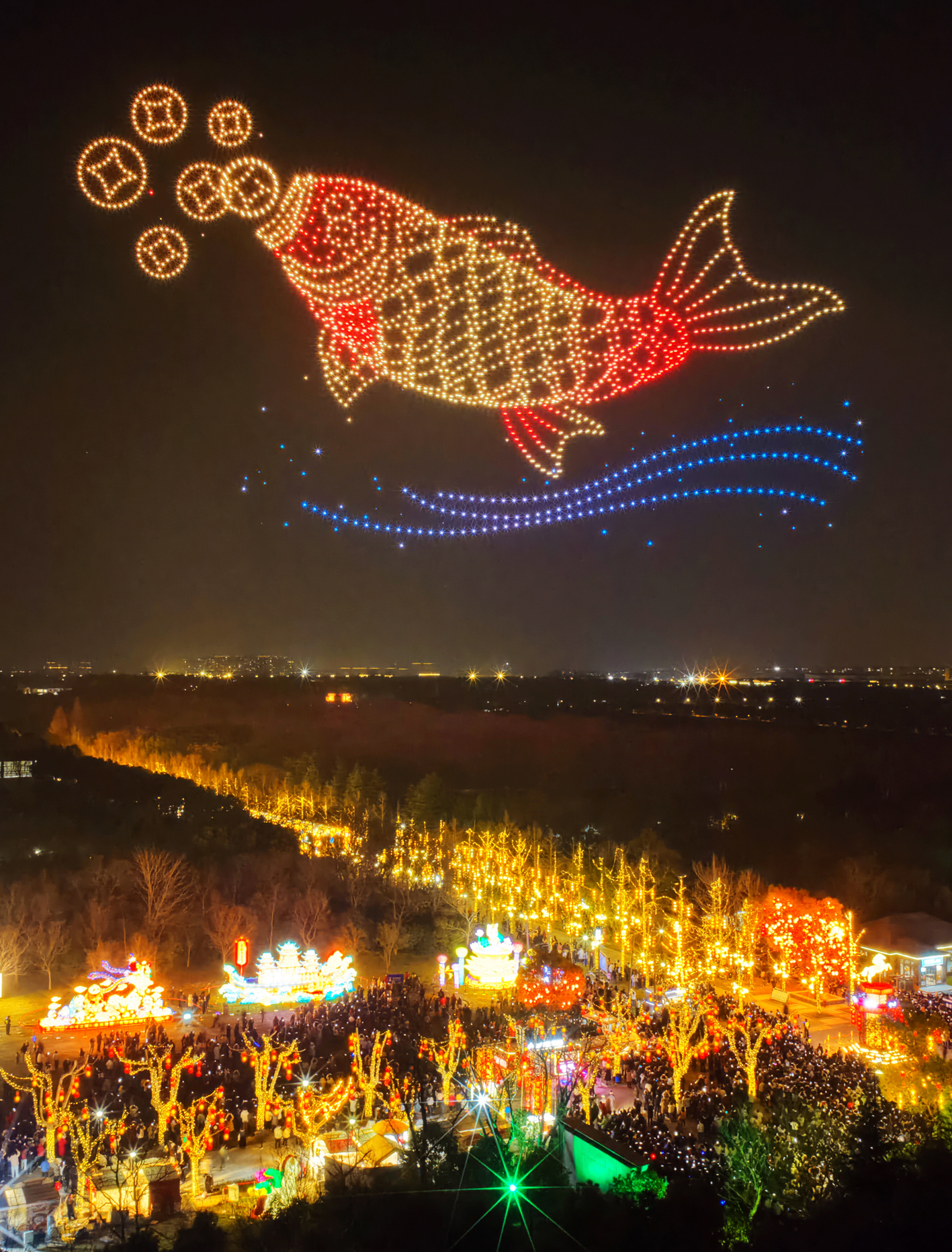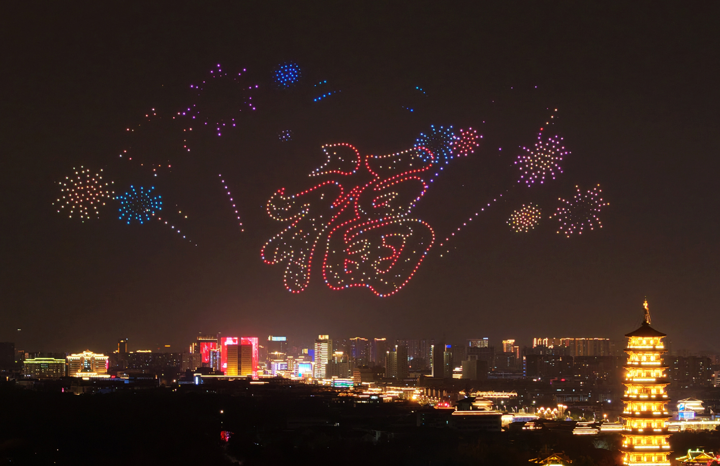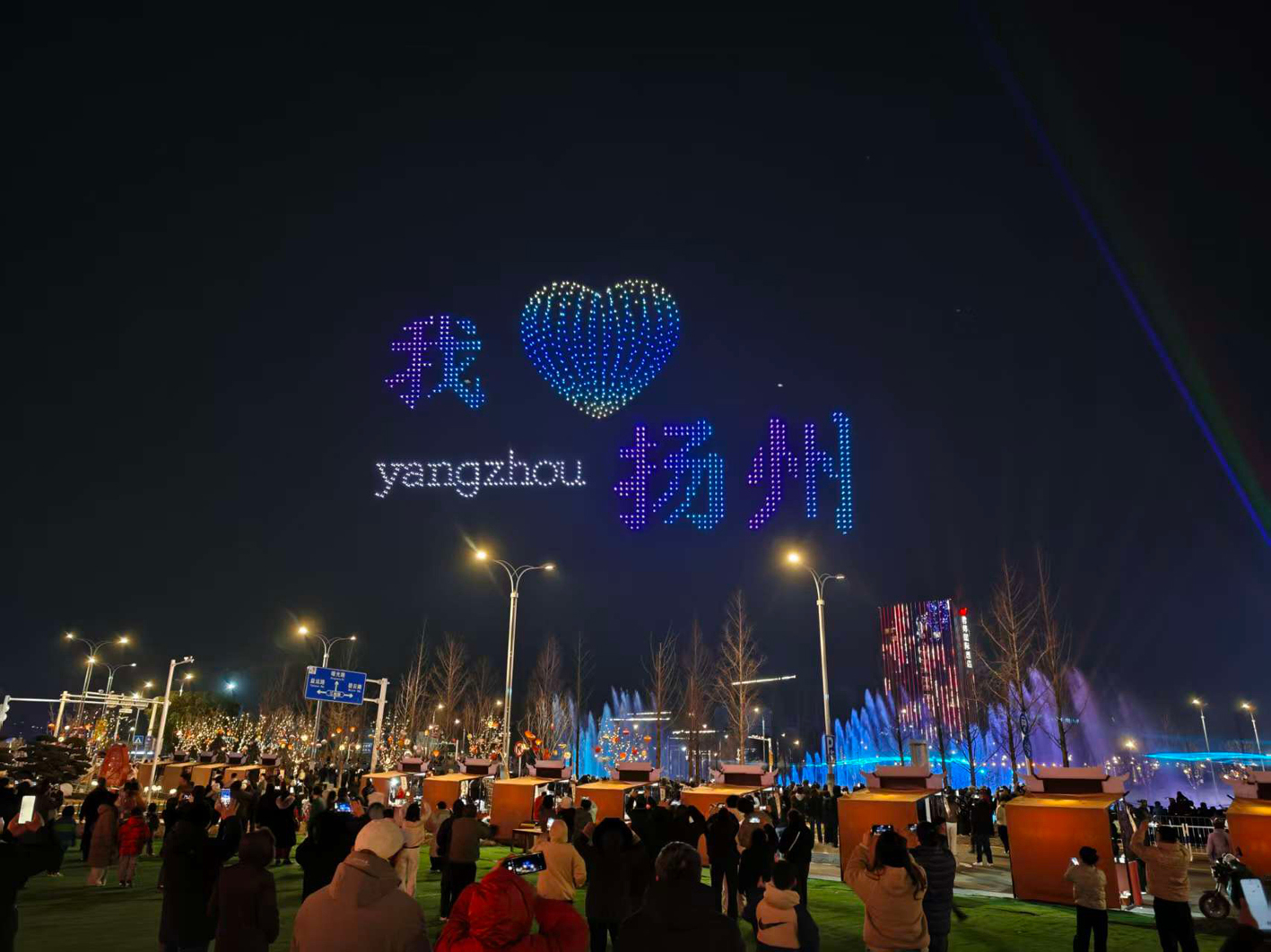 从除夕夜到元宵夜,从平山堂到生态科技新城,千架无人机一次次腾空而起,以夜空为幕、光影为墨,画出扬州地标的剪影,拼出吉祥如意的图腾,也点亮了无数人手机里的朋友圈。