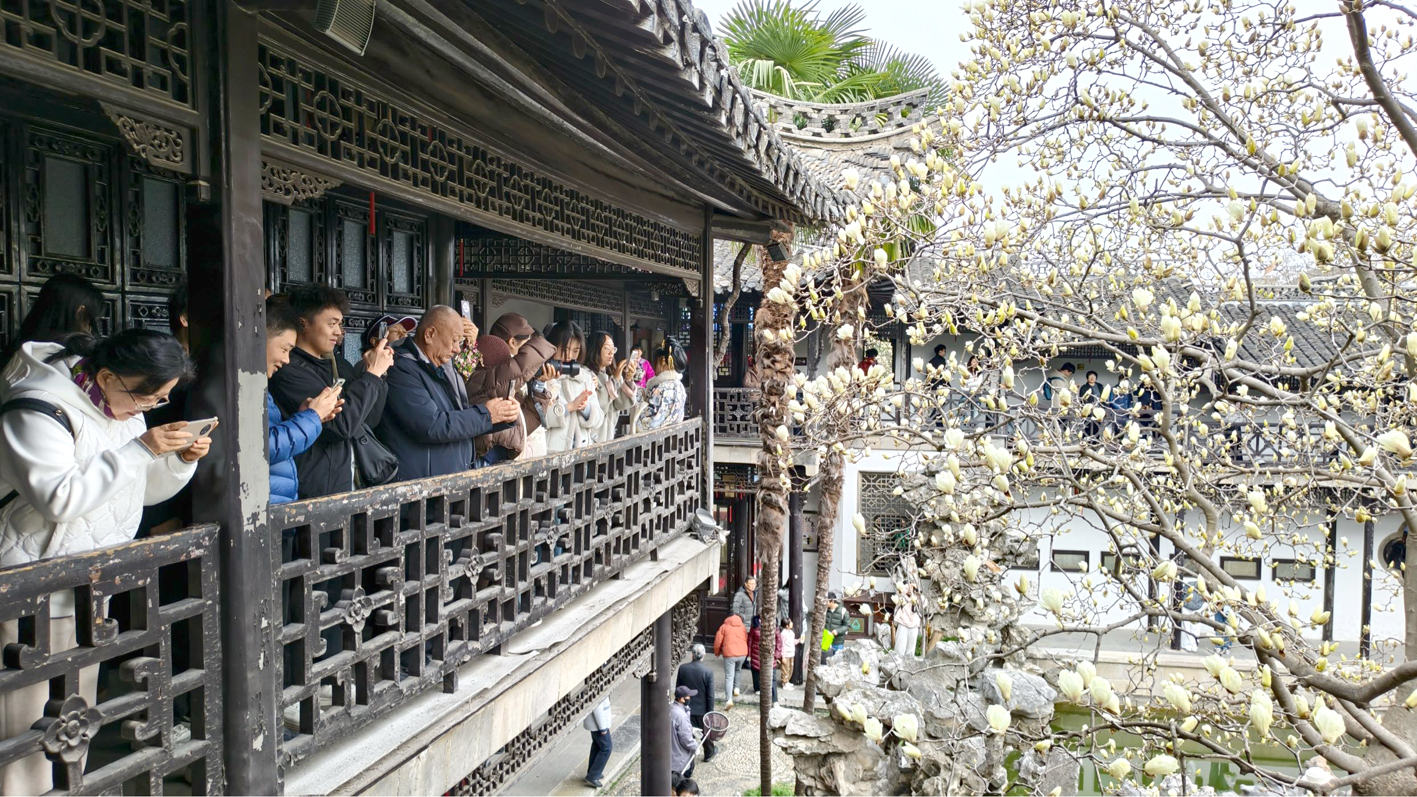 记者从个园、何园景区获悉,红梅、玉兰、垂丝海棠等各色花卉的花期将从3月持续至5月。何园水心亭旁网红白玉兰已含苞待放,预计一周左右将陆续绽放,与古典园林的黛瓦飞檐相映成趣,是扬州春日动人风景。