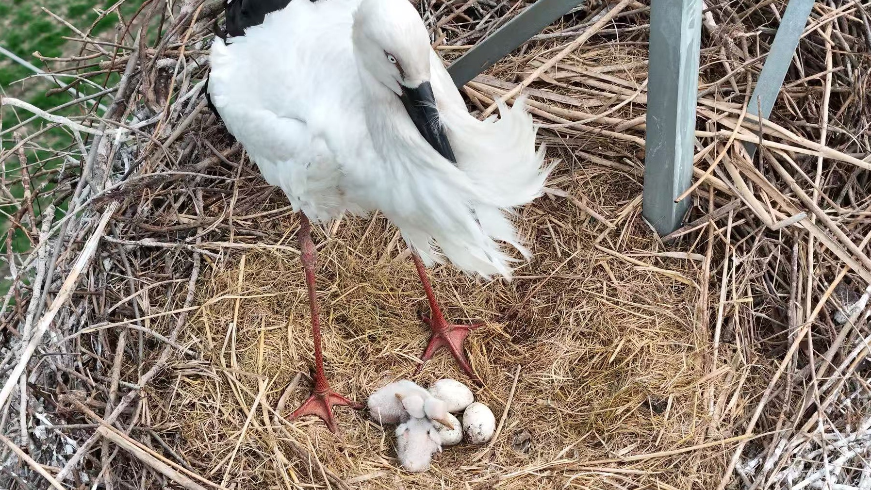 通过航拍镜头看到,在大鸟的精心照料下,2只雏鸟已顺利破壳,体态日渐健壮,时不时探出稚嫩的脑袋,等待亲鸟投喂食物。巢中剩余的1枚鸟蛋,蛋壳已出现细微裂痕,孵化进入尾声,预计不久后,第3只小雏鸟也将破壳而出,为这个“国宝家庭”再添活力。