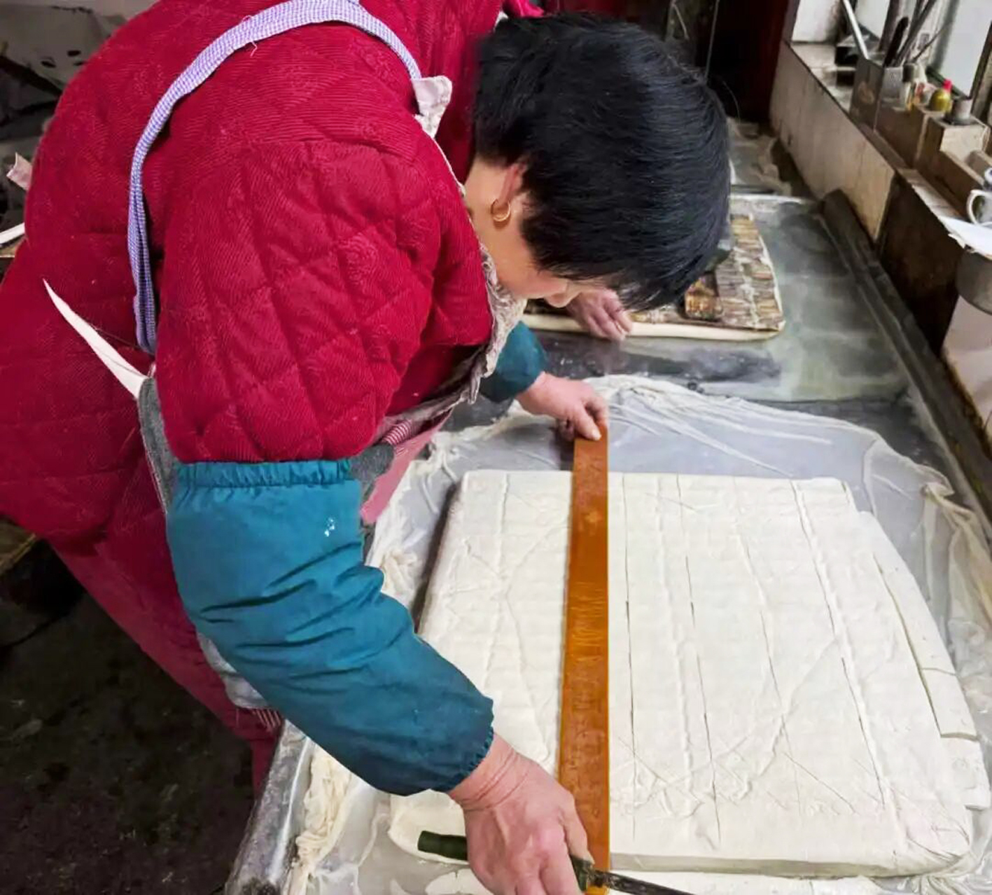 随后,他与老伴默契配合,将卤水与熟豆浆同时倒入大缸,快速而均匀地搅融,而后静静等待。片刻之间,液态的豆浆便缓缓凝结成絮状豆花,温润如雪,软嫩动人。压榨时最热闹。豆花倾入木模,棉布四角轻提,微微晃荡,令其匀实铺陈。盖上木板,压上青石。石重几许,时长几分,皆定豆腐脾性——压得轻、时间短,是盈盈颤颤的嫩豆腐;压得重、时间久,则成紧实耐嚼的老豆腐。水分慢慢渗出,豆腐就这样呈现在了眼前。移石揭布,一整板方正洁白、温润如玉的豆腐映入眼中。徐兴业的老伴手执刀与尺,划成均匀小块。徐兴业将豆腐装入筐内,骑上电动三轮,送往周边超市与饭店。有时老伴会接替他送货,也常有老顾客专程循着豆香上门,只为买上一块新鲜出炉的手工豆腐,这一来一往间,皆是街坊邻里的信任与温情。豆腐做好后,忙碌的日子并未停歇。