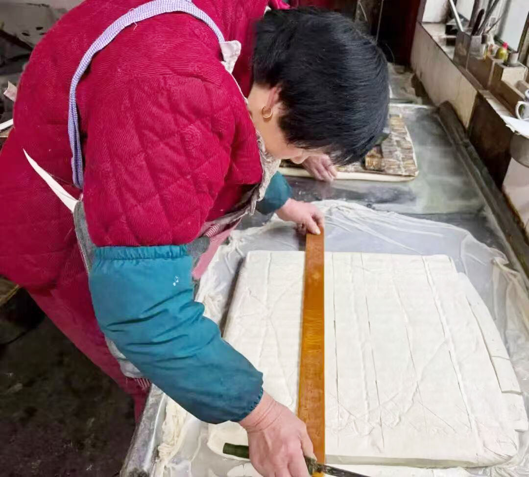 移石揭布,一整块方正洁白、温润如玉的豆腐映入眼中。徐兴业的老伴手执刀与尺,划成均匀小块。徐兴业将豆腐装入筐内,骑上电动三轮,送往周边超市与饭店。有时老伴会接替他送货,也常有老顾客专程循着豆香上门,只为买上一块新鲜出炉的手工豆腐,这一来一往间,皆是街坊邻里的信任与温情。豆腐做好后,忙碌的日子并未停歇。