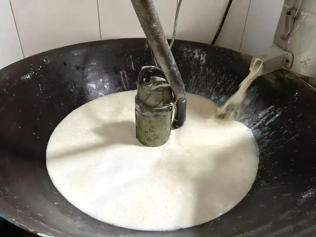 煮浆则最考验耐心。抽浆机将细腻的豆浆送入铁锅,柴火在灶膛里缓缓燃烧,徐兴业或老伴手持木勺,在锅中不停搅动,生怕豆浆受热不均而焦煳。当表面泛起细密的泡沫时,再用消泡勺轻轻撇去,随着蒸汽渐渐浓郁,整个豆腐坊都被醇厚的豆香包裹,那是独属于手工豆腐的烟火气息,也成了老街人最熟悉的清晨味道。