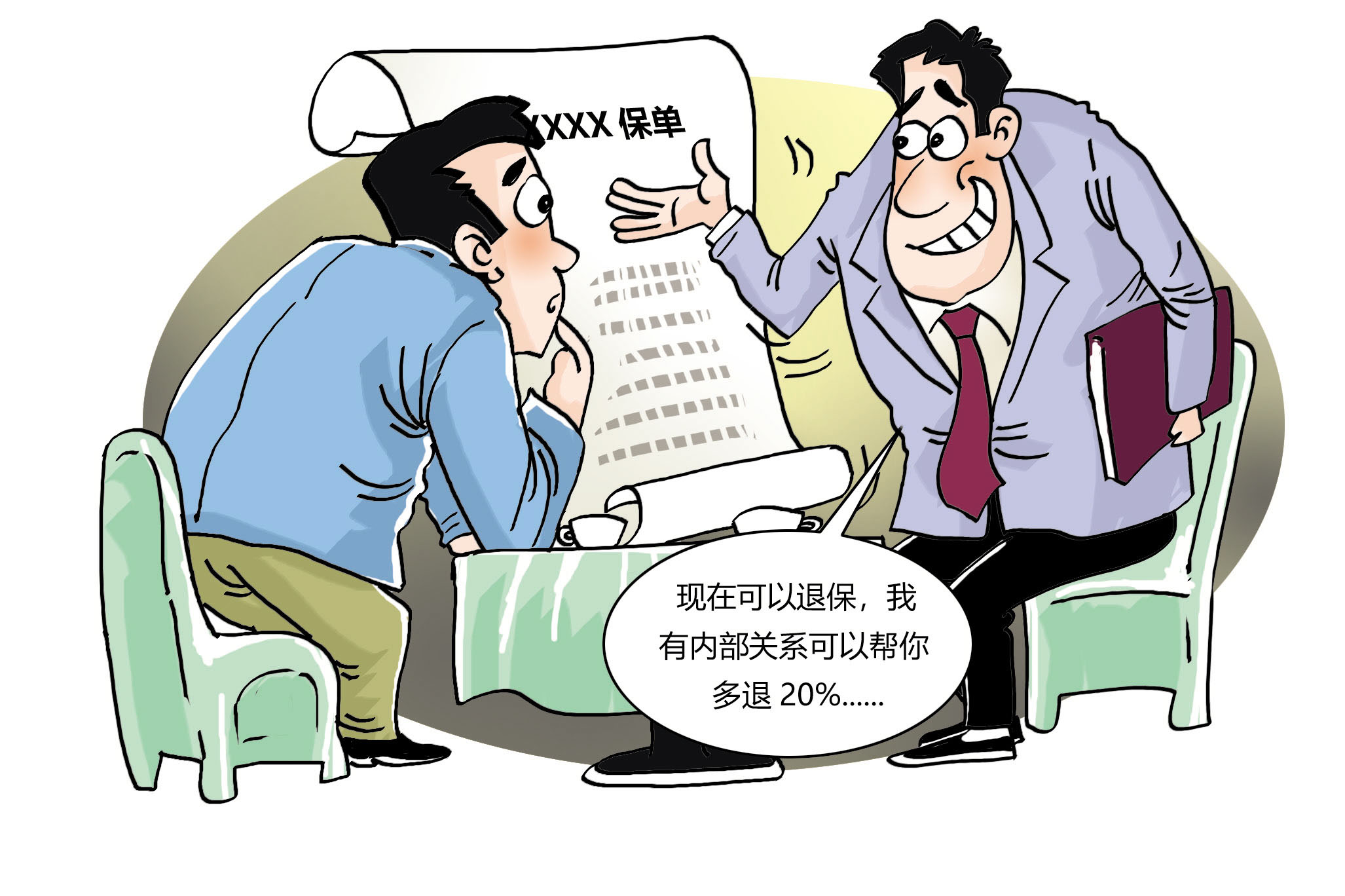 对方说,“现在可以退保,我有内部关系可以帮你多退20%。”随后,对方又提出条件,他可以帮助吴先生办理退保,但多退的钱要分一半给他。