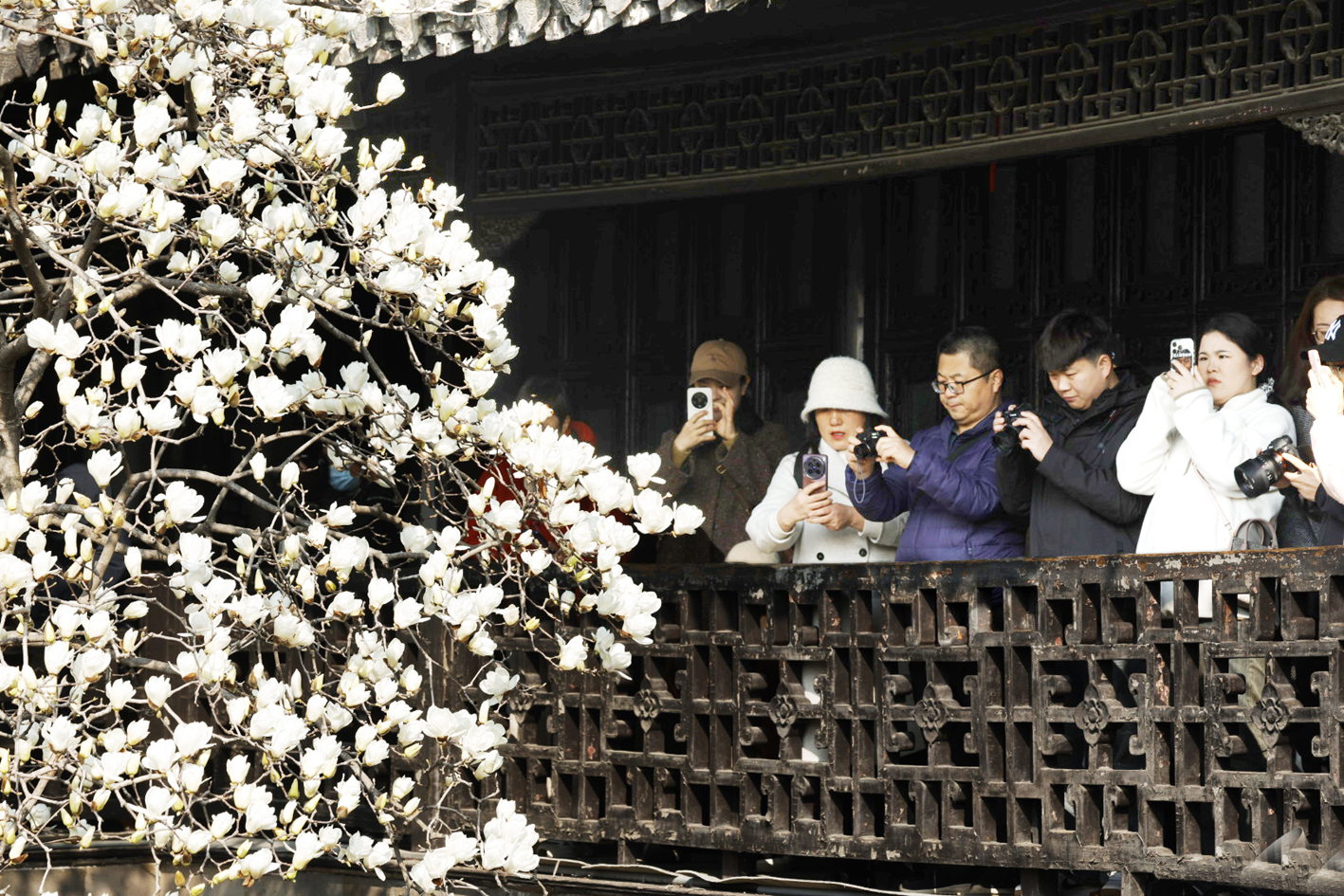 游客欣赏何园的网红玉兰。 严柏平 程曦 摄
