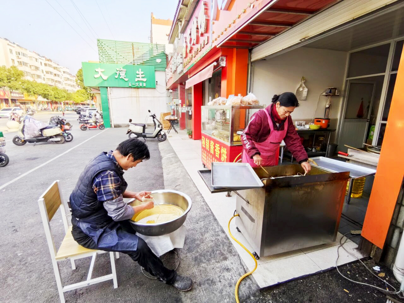 3月10日凌晨两点半,仪征城北农贸市场边的一盏灯却亮着。年过五旬的仪征市民杨蓝海和妻子成家珍已经开始了新一天的忙碌。和面、揉面、醒面……这家专卖各种饼和麻花馓子的小店,每天要准备数十斤的面团,只为在清晨迎接顾客。