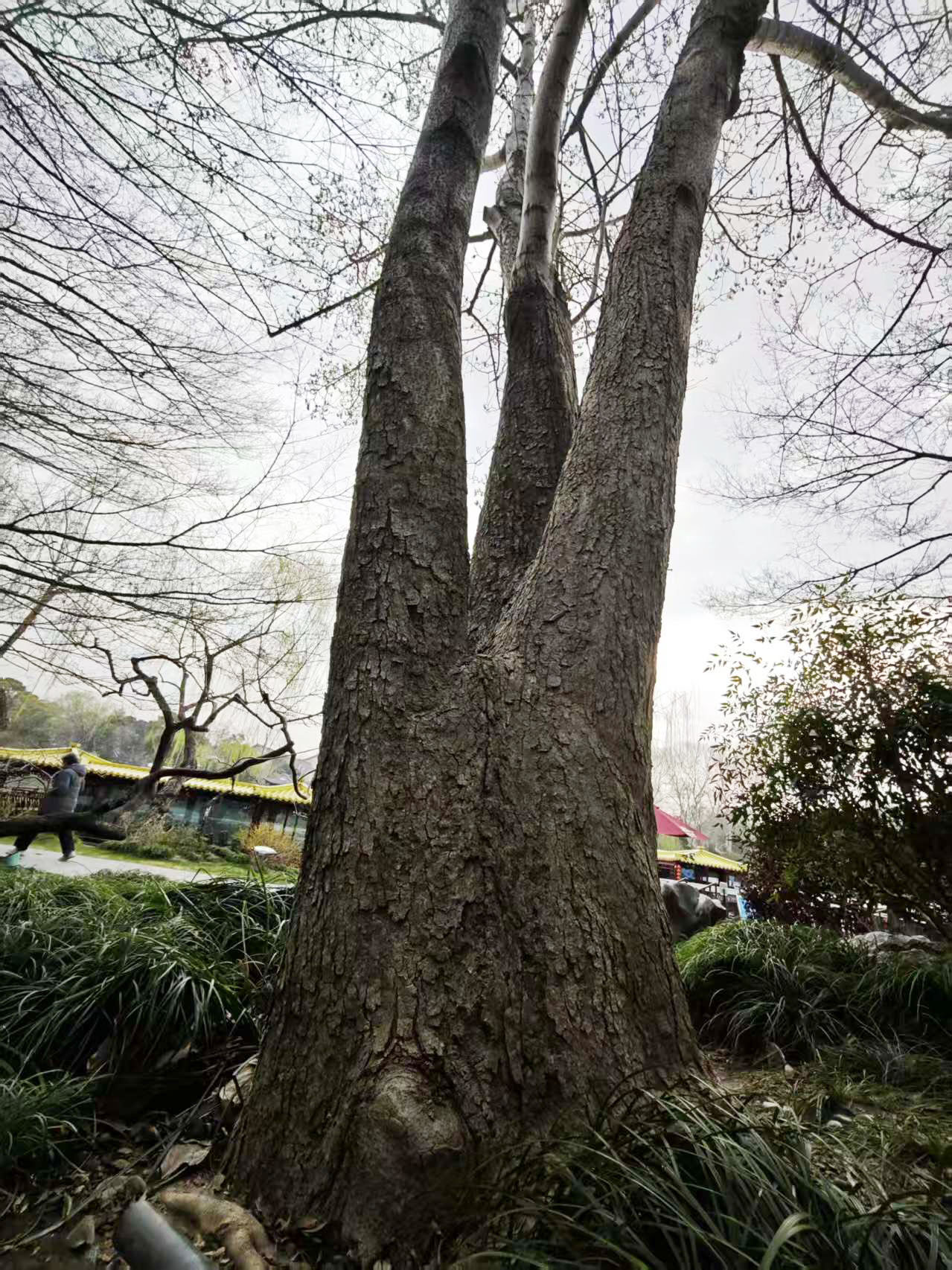 这棵玉兰古树位于瘦西湖南门码头旁,树形挺拔,树高12米,冠幅11米,主干从不到1米的地方分成三枝,这三枝单独看也各成大树。树上有扬州市绿化委员会2016年悬挂的铭牌,树龄95年,算下来今年已有105岁了。