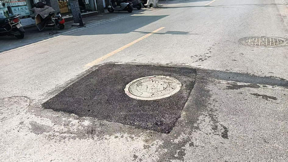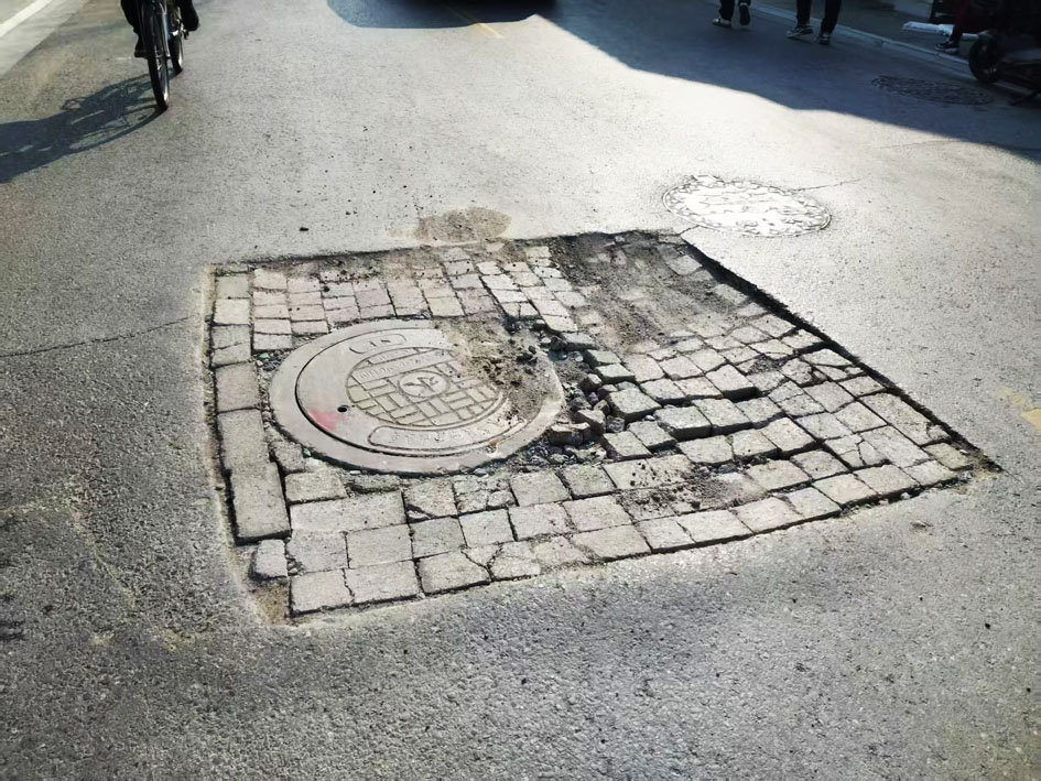网友告诉记者,这里的窨井井口之前出现沉降,有关部门来进行了维修,浇灌混凝土加固,路面暂用面包砖填充。几天前井口不知道被什么车碾轧,又被轧塌了,面包砖陷下去5厘米。