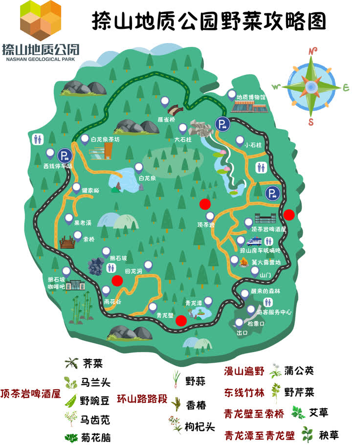 近期春雨充沛,仪征捺山地质公园迎来了野菜采摘的好时节。记者发现,在环山路路段,可以寻到野蒜、香椿与枸杞头;沿着东线竹林深入,鲜嫩的野芹菜正等待着被发现;从青龙壁至索桥的途中,清香的艾草随处可见;漫步在青龙潭至青龙壁一带,能采到鲜灵的秧草;而在顶茶岩啤酒屋周边,荠菜、马兰头、野豌豆、马齿苋、菊花脑这些春日里的常见野菜都能找到,公园内更是漫山遍野生长着蒲公英,处处都是春日的馈赠。