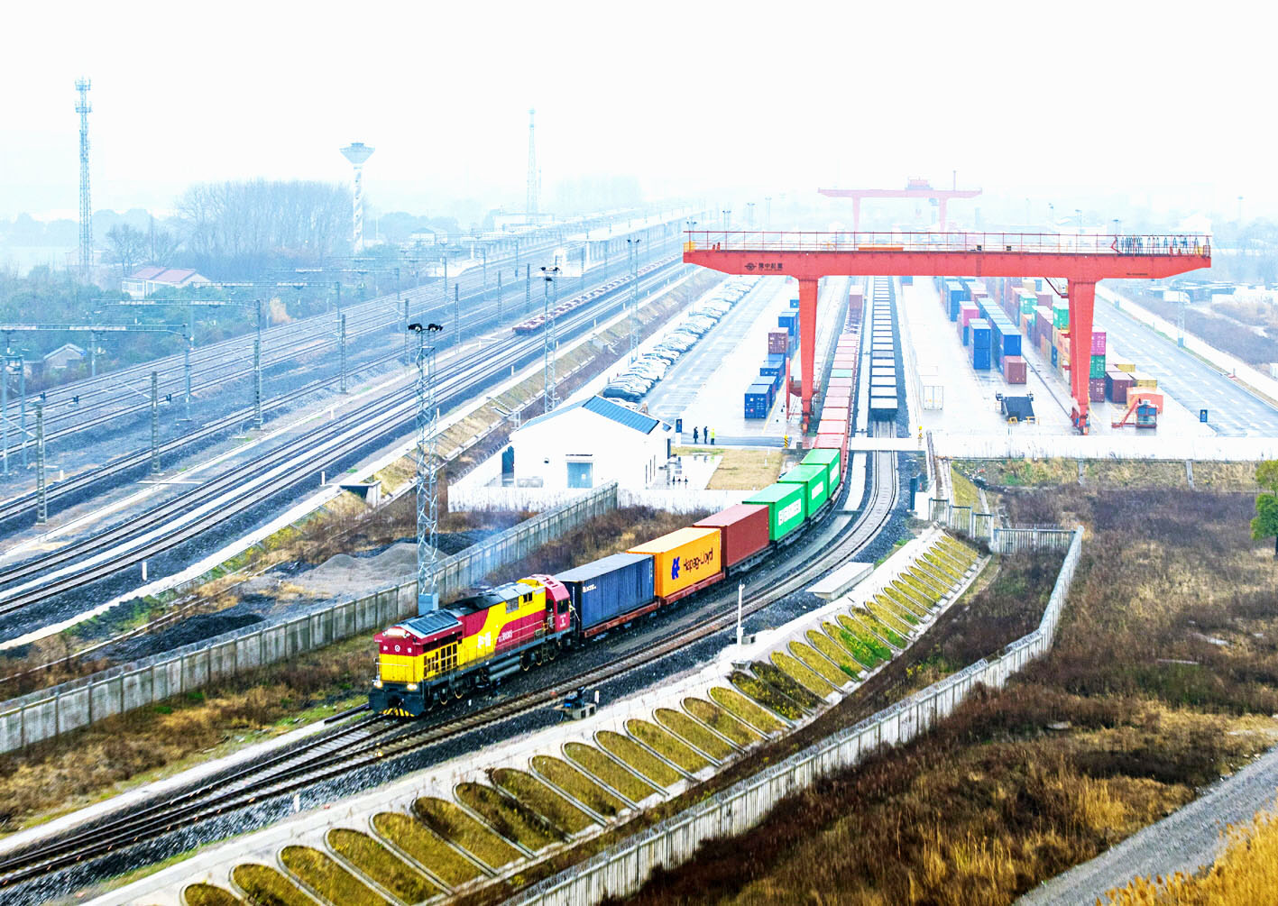 扬州江都铁路专用线于2024年10月开通,初期每周开行3列左右,此次升级为每日一班,预计年发送货物35万吨。图为3月16日拍摄的江都物流基地(无人机照片)。 新华社发 (任飞 摄)